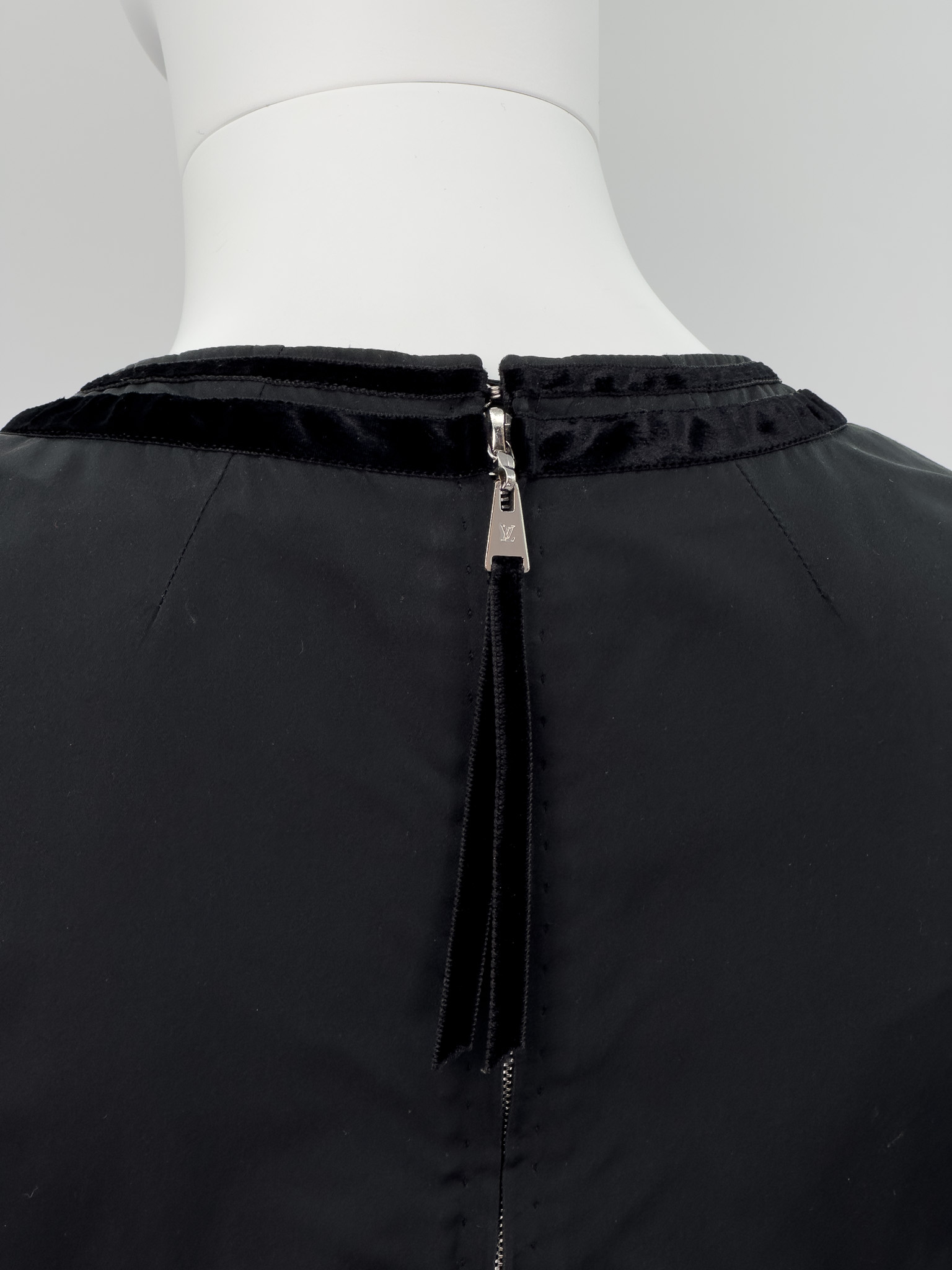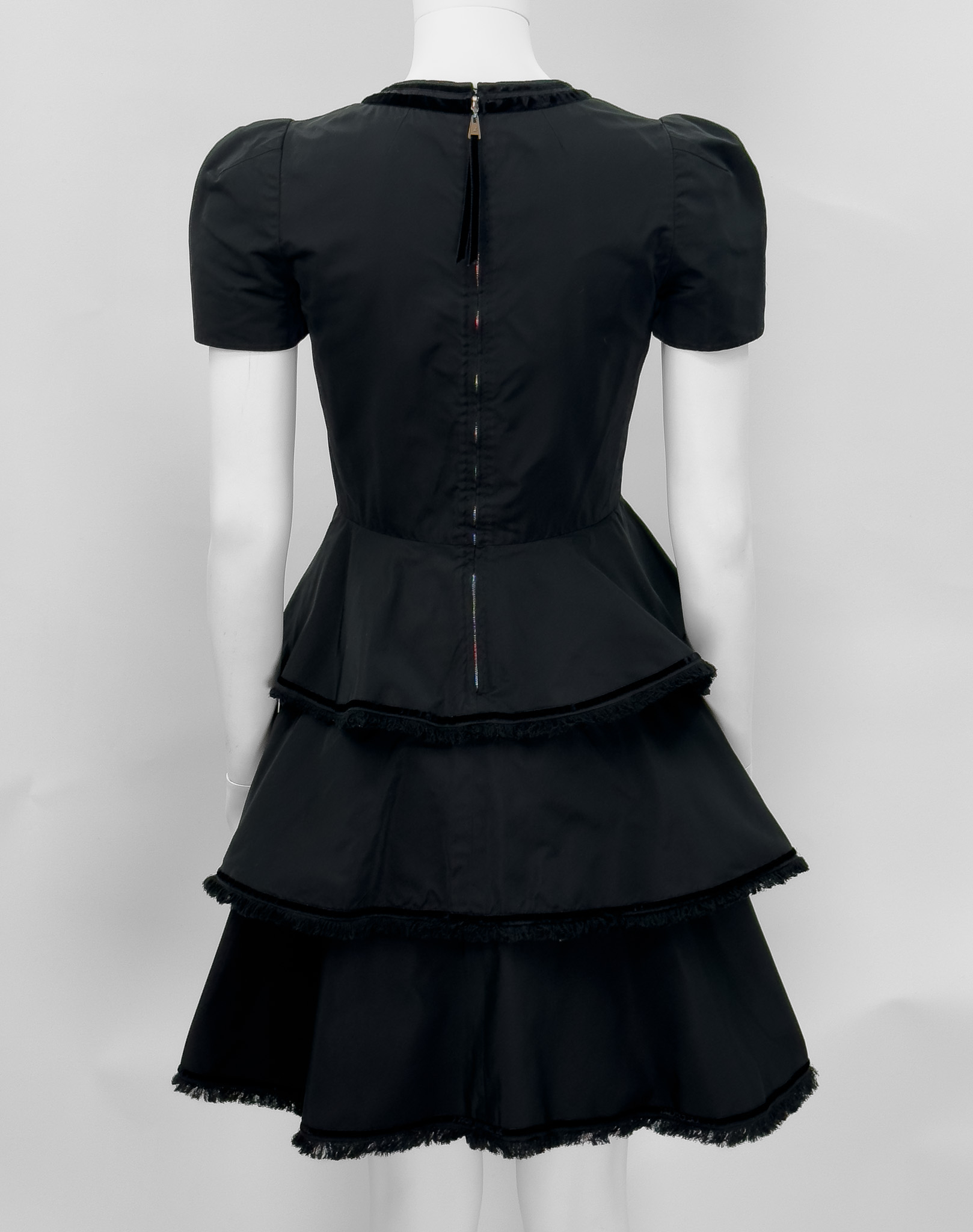 "Czarna sukienka z krótkim rękawem ozdobiona welurowymi wstawkami, śliski materiał, długość do kolan, zaokrąglony dekolt, rozkloszowany dół wykończony falbanami oraz delikatnymi frędzlami, zapinana w tylnej części na srebrny logowany suwak, haftkę oraz zatrzask. Rozmiar z metki FR 34. Wycięta metka ze składem. Wymiary: szerokość mierzona od pachy do pachy 41cm, długość całkowita 91cm."