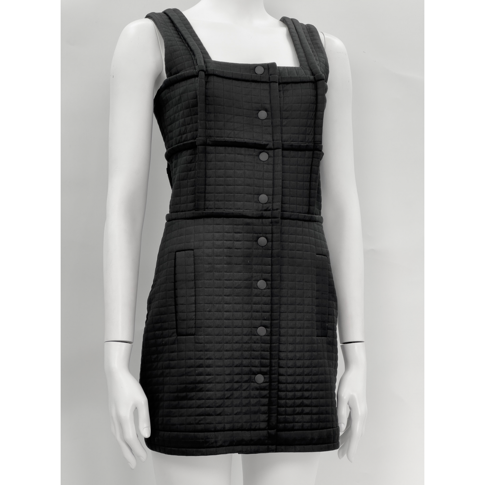 "Czarna sukienka na szerokich ramiączkach, wykończona kwadratowymi przeszyciami, długość mini, taliowana, prosty dekolt, zapinany na zatrzaski w centralnej części, dwie kryte kieszenie po bokach, brak podszewki. Rozmiar z metki 36. Skład: 100% poliester. Wymiary: szerokość mierzona od pachy do pachy 42cm, długość całkowita 82cm."