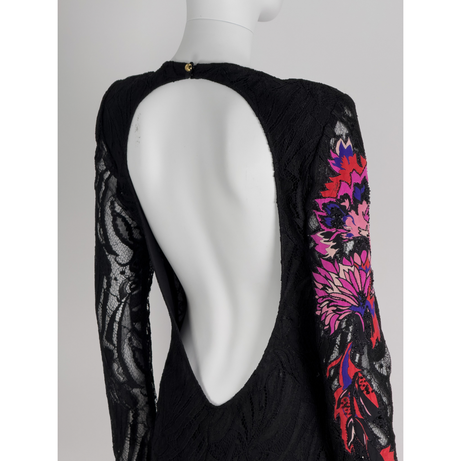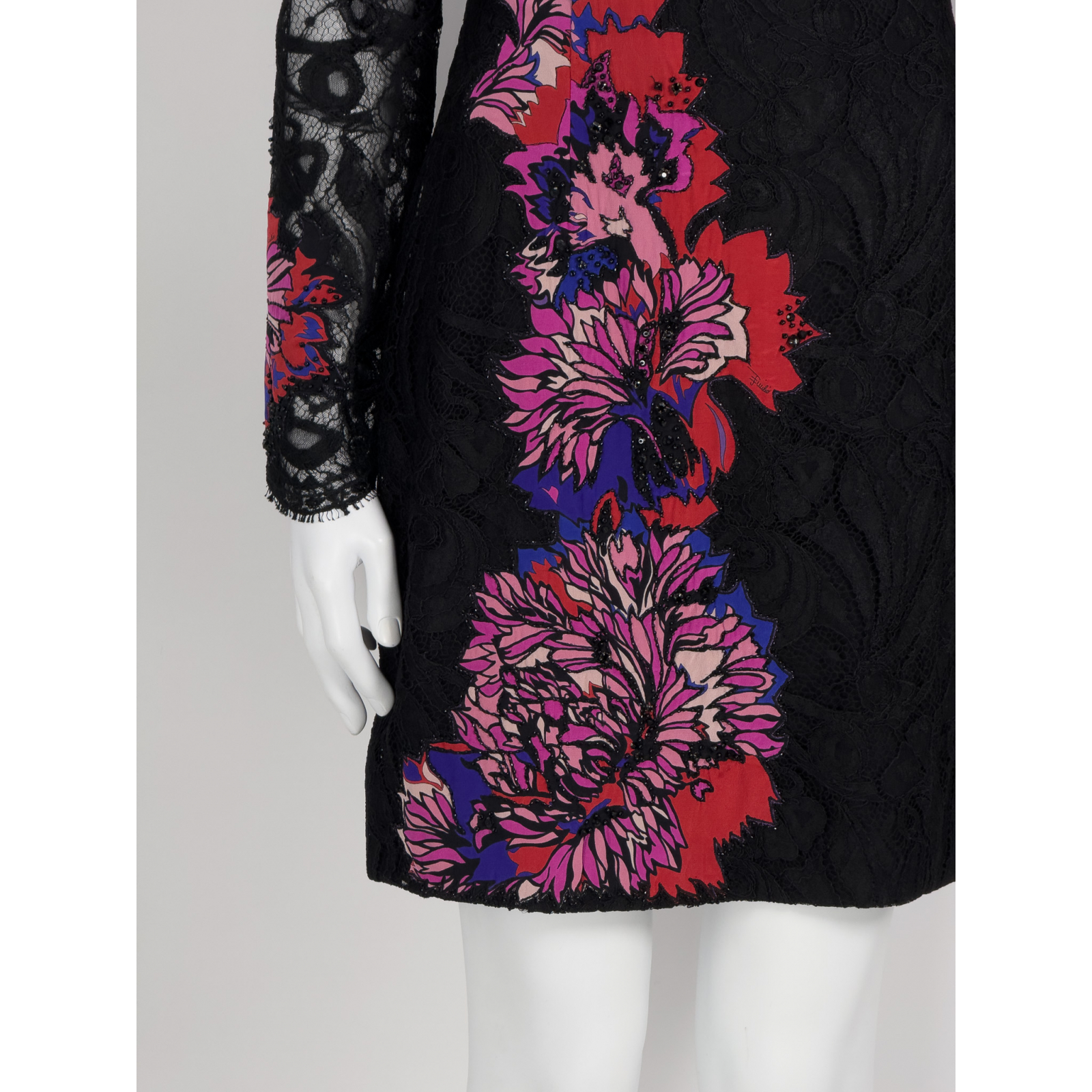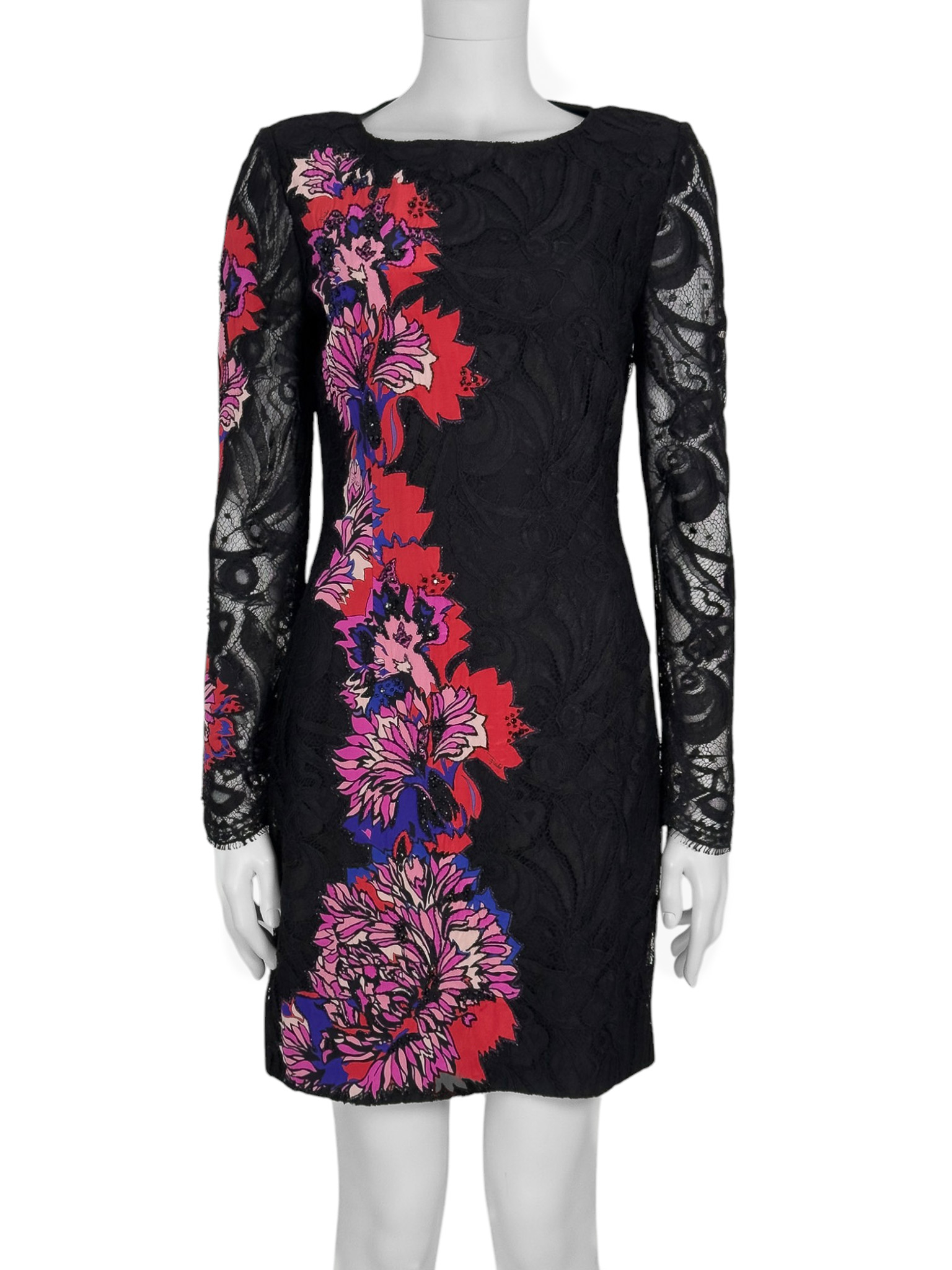 "Czarna koronkowa sukienka z długim rękawem ozdobiona grafiką czerwono-fioletowych kwiatów z logo marki, zaokrąglony dekolt, prosty krój, długość ptzed kolano, głęboki dekolt na plecach, poduszki na ramionach, zapinana w bocznej części na kryty suwak, dwie haftki w okolicy szyi oraz złoty guzik. Stan nowa z metką. Rozmiar z metki IT 44. Skład: 100% poliamid; 75% wiskoza, 25% poliamid. Wymiary: szerokość mierzona od pachy do pachy 45cm, długość całkowita 91cm."