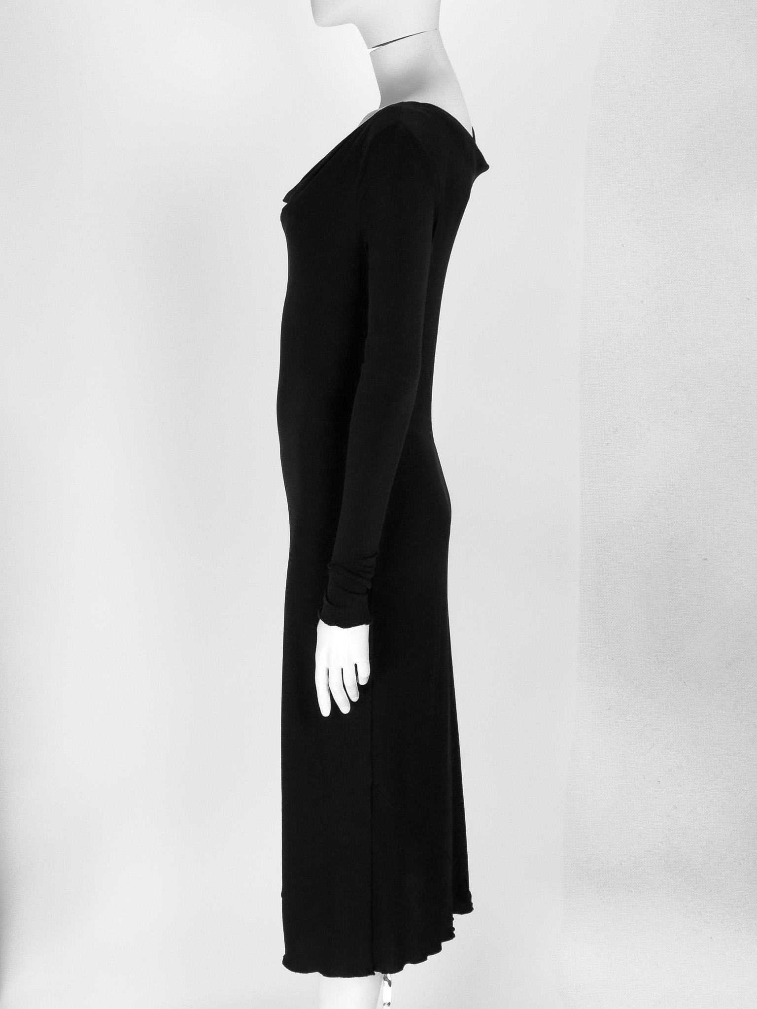 "Czarna sukienka, dopasowany krój, długi rękaw, lejący materiał, odwijany dekolt w łódkę na przodzie i z tyłu na plecach, długość midi. Rozmiar z metki IT 40. Skład: 64% rayon, 26% poliamid, 10% elastan. Wymiary: szerokość mierzona od pachy do pachy 45cm, długość całkowita 116cm."