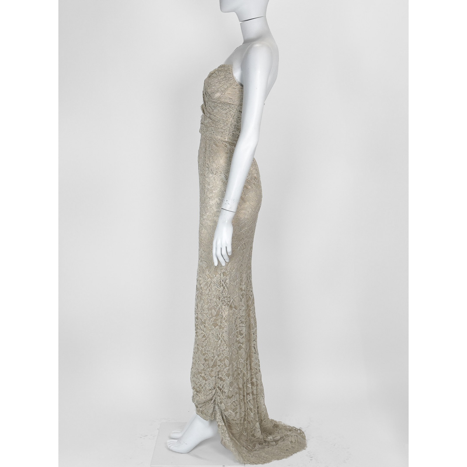 "Beżowa koronkowa szampańska sukienka w motyw kwiatów, bez ramiączek, długość maxi, dekolt serce, wszyte usztywnienia oraz fiszbiny, zapinana w tylnej części na srebrny logowany suwak. Stan dobry, posiada delikatną plamę na wysokości biustu. Rozmiar z metki IT 40. Skład: 75% wiskoza, 25% poliamid; podszewka: 96% jedwab, 4% elastan. Wymiary: szerokość mierzona od pachy do pachy 39cm, długość całkowita 133cm."