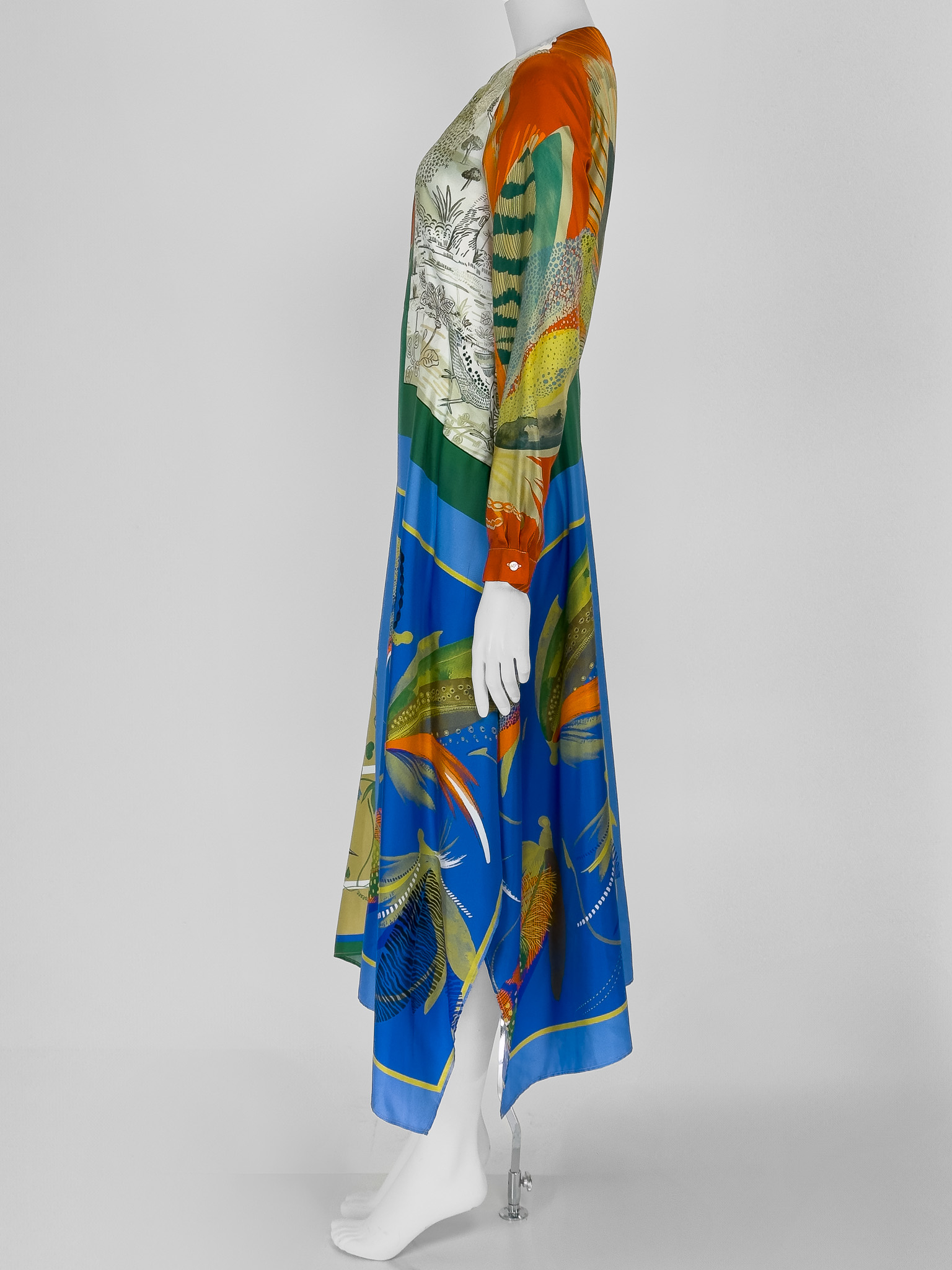 "Wielobarwna jedwabna sukienka z długim rękawem w odcieniach zieleni, pomarańczu, kremu, niebieskiego i żółtego koloru, ozdobiona grafiką ptaków, zaokrąglony dekolt, taliowana, rozkloszowany dół, rozpinane mankiety, zapinana na lewym ramieniu na logowane guziki. Rozmiar z metki IT 42. Skład: 100% jedwab; podszewka: 100% poliester. Wymiary: szerokość mierzona od pachy do pachy 49cm, długość całkowita 139cm."