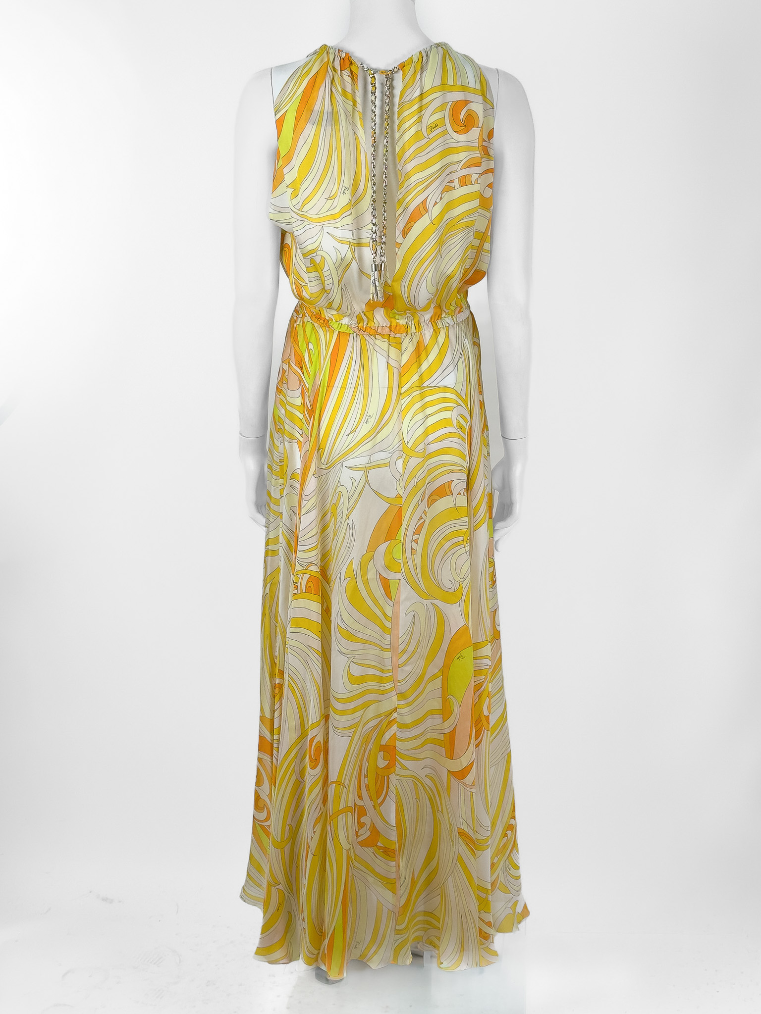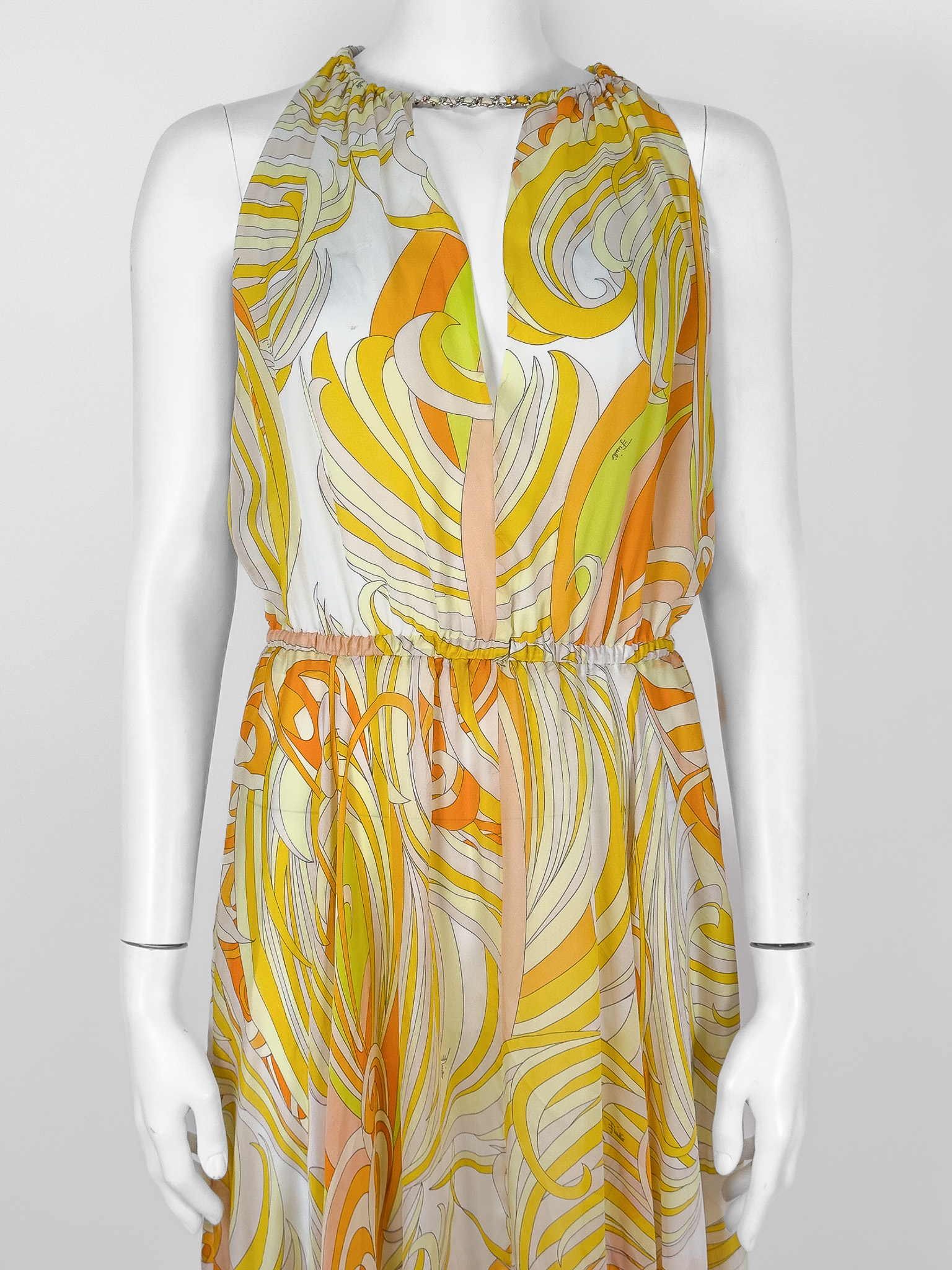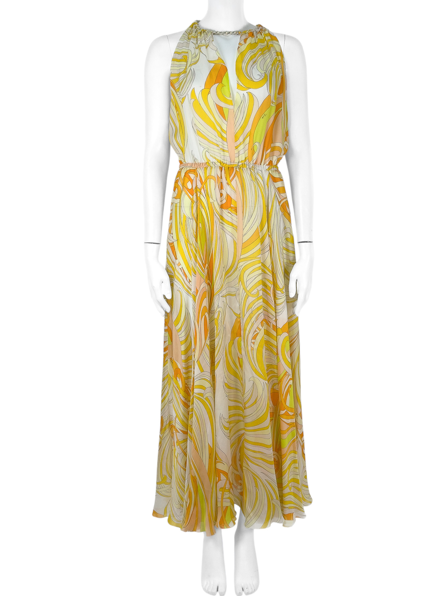 "Żółto-pomarańczowo-liliowa jedwabna sukienka bez rękawów, ozdobiona wzorem z delikatnym logo marki, zaokrąglony dekolt, długość maxi, srebrny łańcuch przy dekolcie, taliowana, guma w talii. Stan bardzo dobry. Rozmiar z metki FR 42. Skład: 100% jedwab. Wymiary: szerokość mierzona od pachy do pachy 53cm., długość całkowita 142cm."