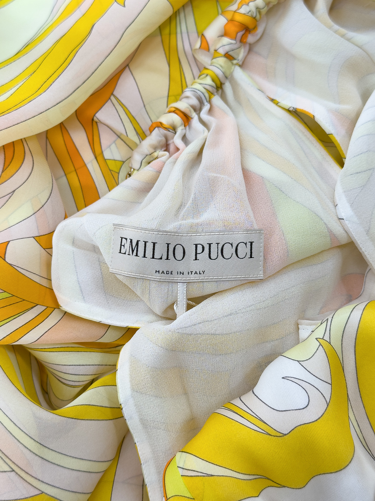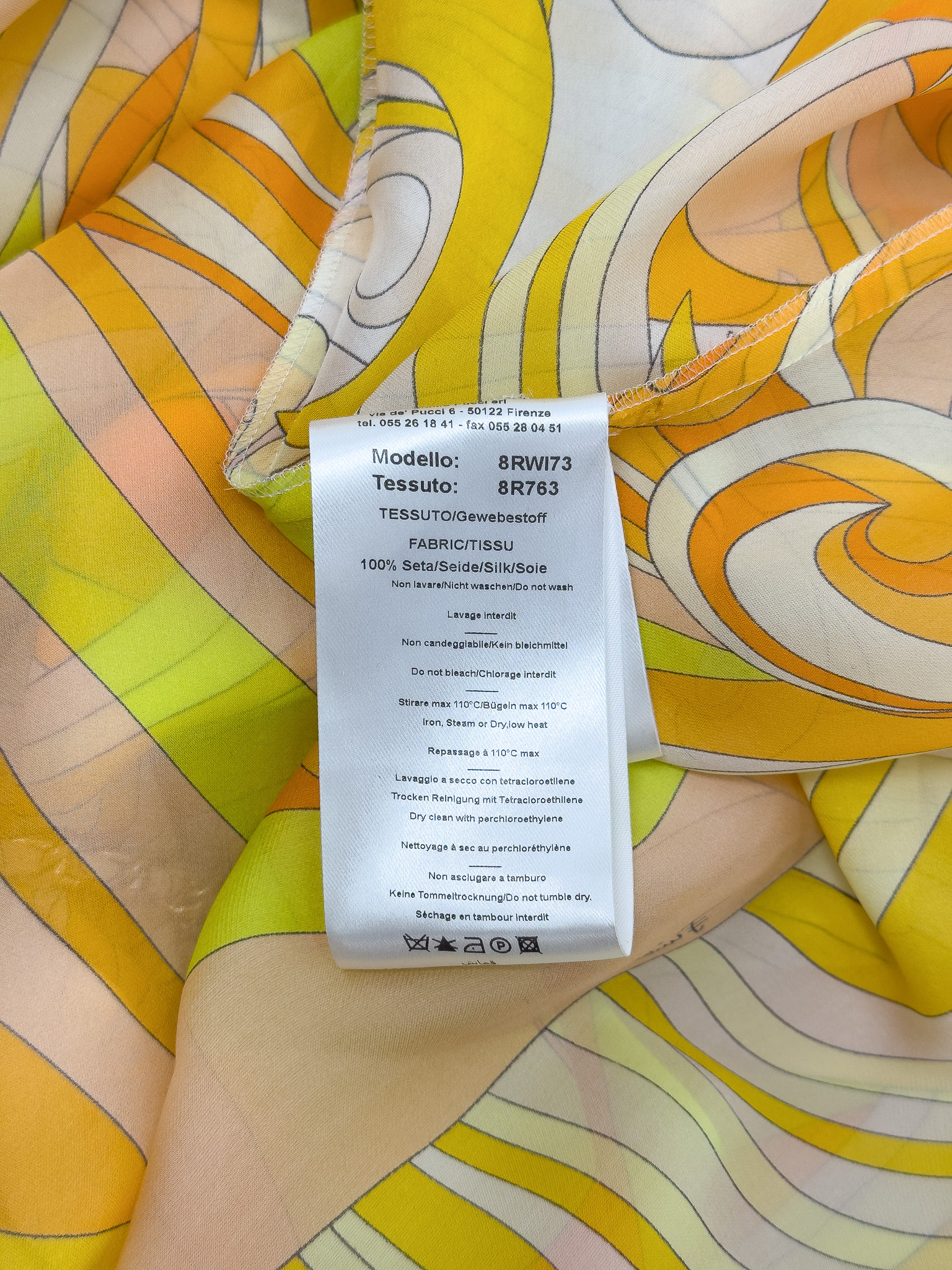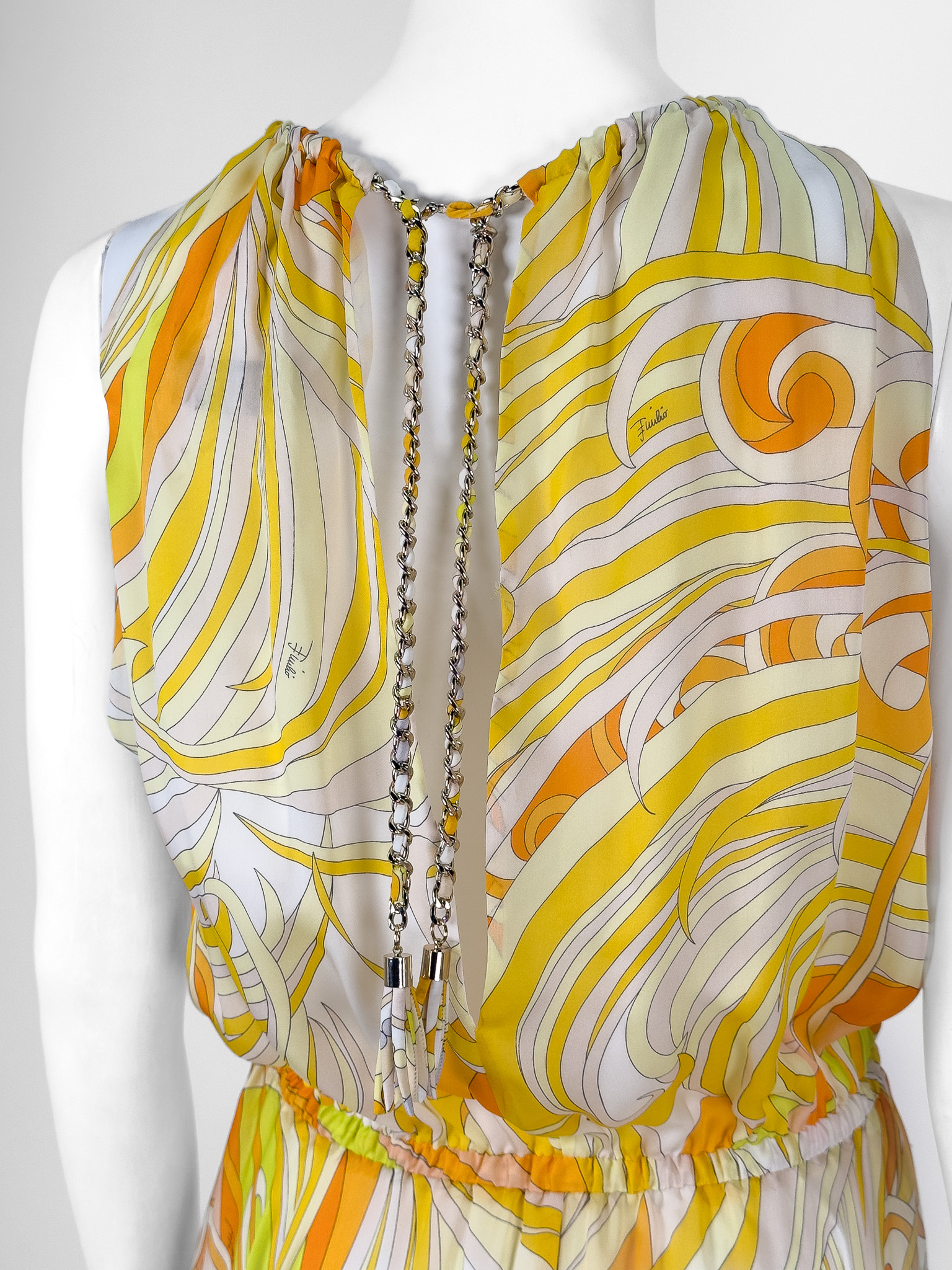 "Żółto-pomarańczowo-liliowa jedwabna sukienka bez rękawów, ozdobiona wzorem z delikatnym logo marki, zaokrąglony dekolt, długość maxi, srebrny łańcuch przy dekolcie, taliowana, guma w talii. Stan bardzo dobry. Rozmiar z metki FR 42. Skład: 100% jedwab. Wymiary: szerokość mierzona od pachy do pachy 53cm., długość całkowita 142cm."