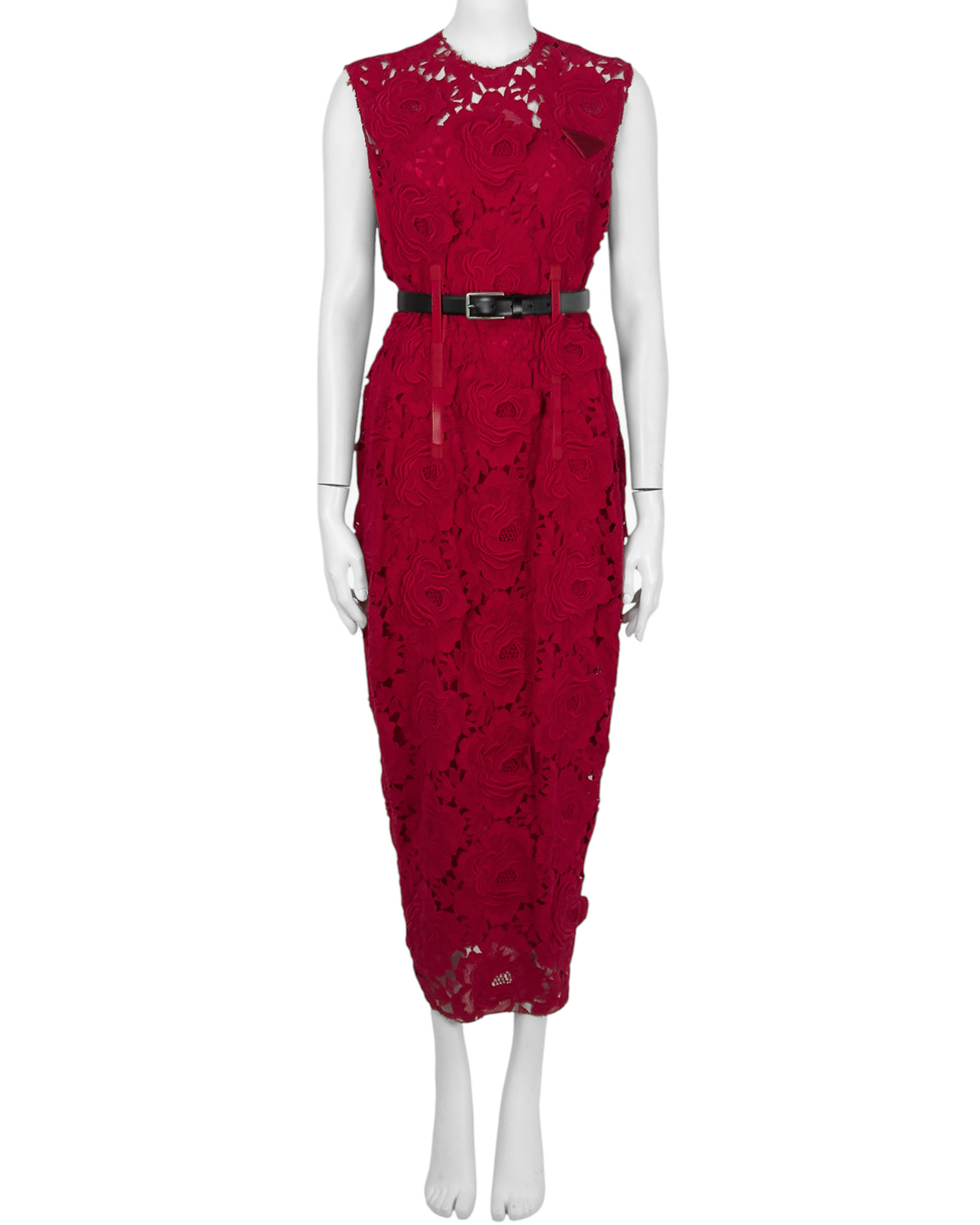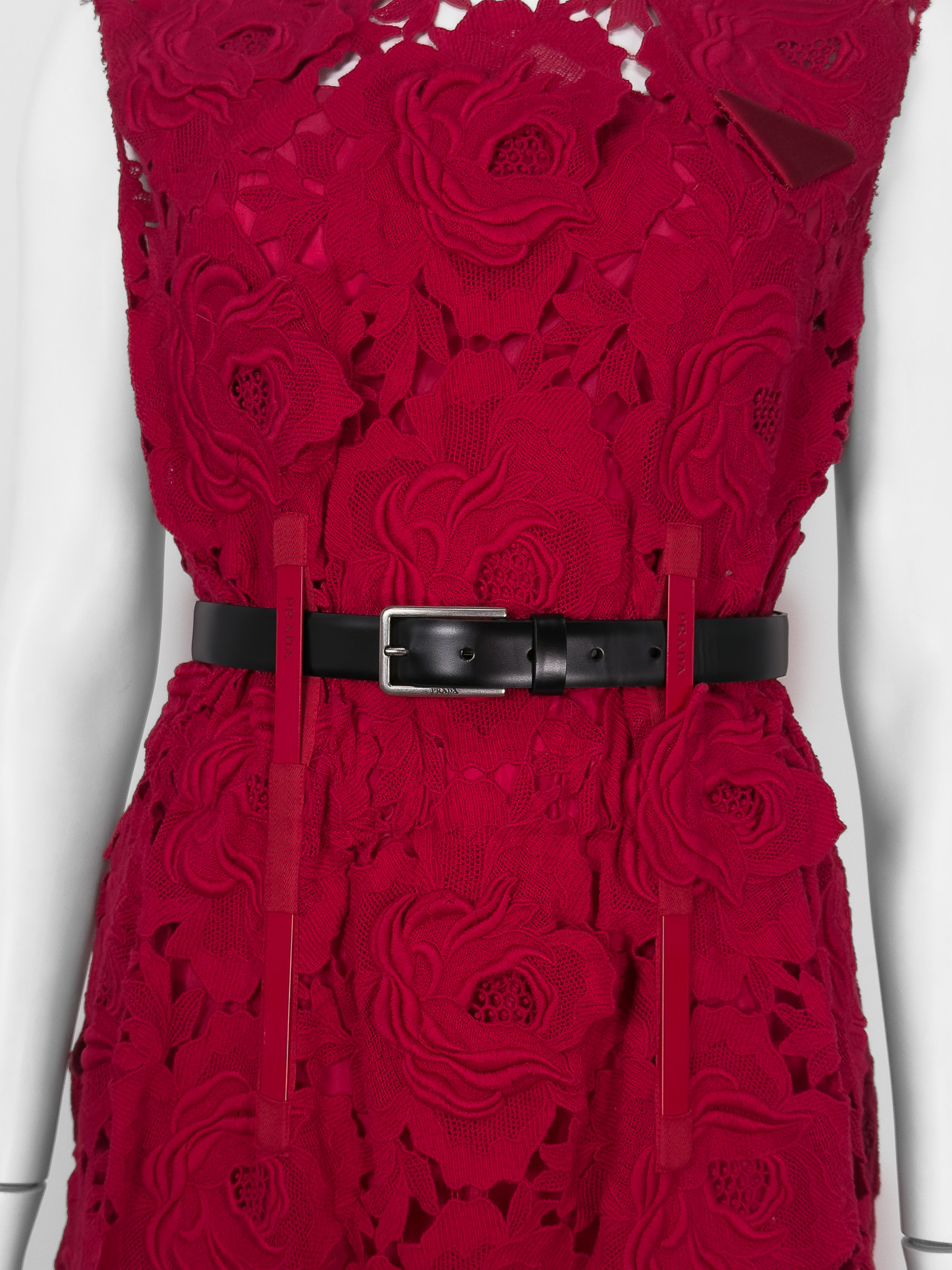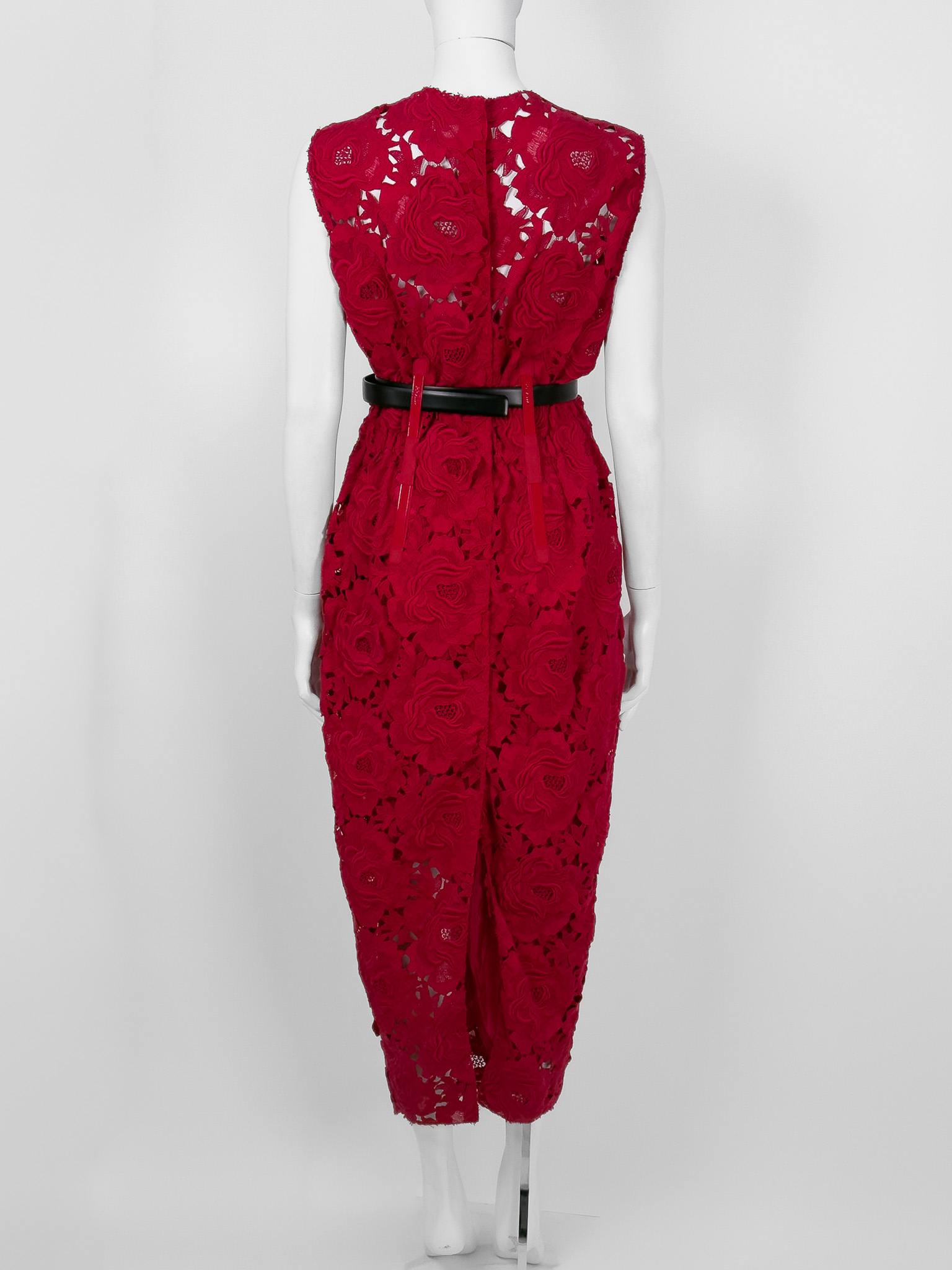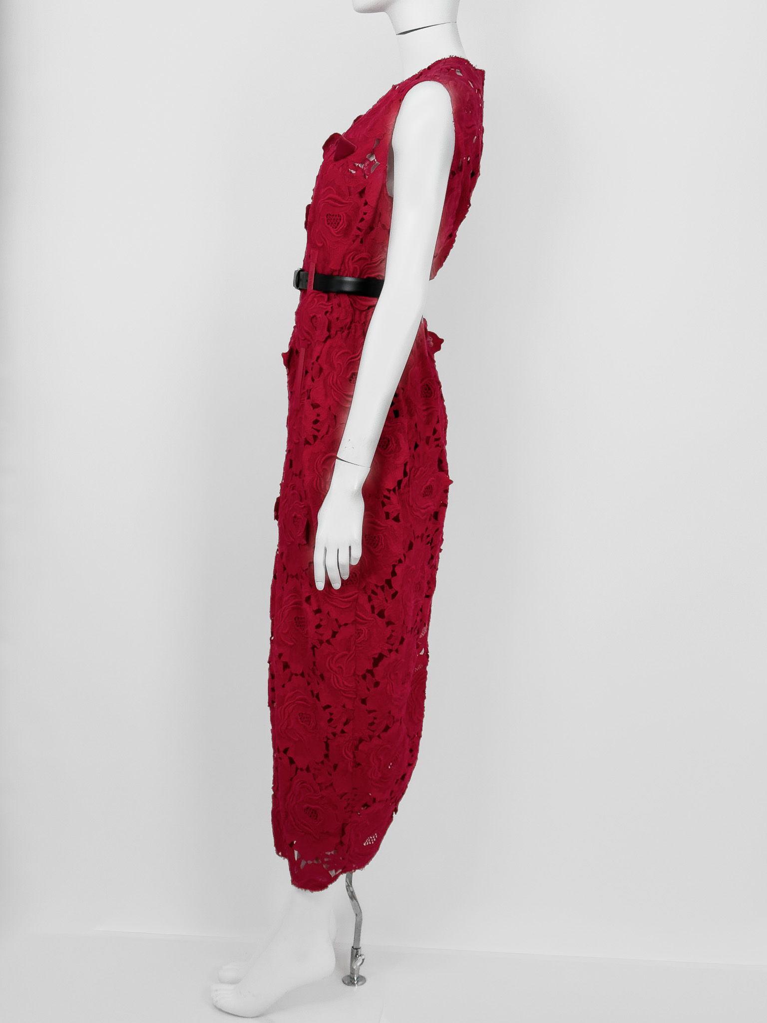"Czerwona sukienka w motyw kwiatowy, ażurowa, bez rękawów, zaokrąglony dekolt, trójkątna naszywka w kształcie logo marki w okolicy biustu, czarny logowany pasek wykończony srebrną klamrą oraz szerokie szlufki w talii, rozcięcie w tylnej części, zapinana na duże kryte zatrzaski, poszewka na ramiączkach, w zestawie z metką. Stan bardzo dobry. Rozmiar z metki IT 46. Skład podszewki: 60% kupro z recyklingu, 40% jedwab. Wymiary sukienki: szerokość mierzona od pachy do pachy 54cm, długość całkowita 135cm."