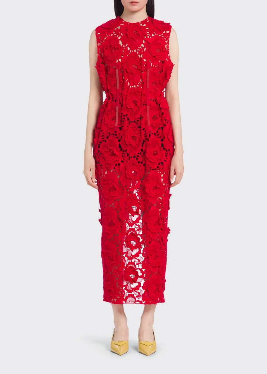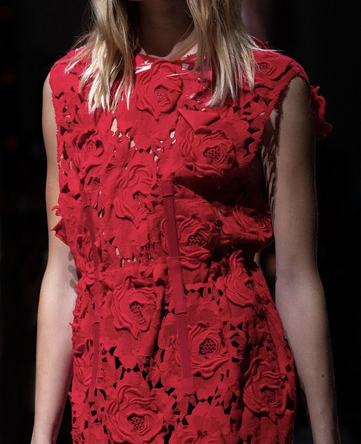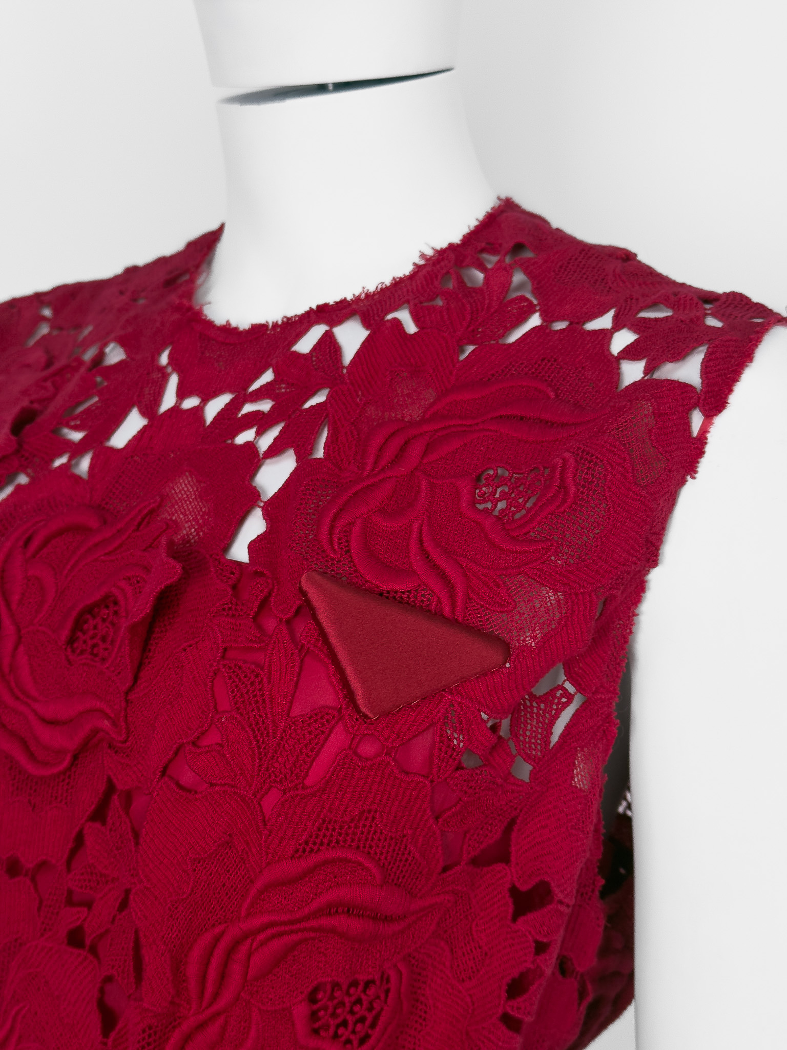 "Czerwona sukienka w motyw kwiatowy, ażurowa, bez rękawów, zaokrąglony dekolt, trójkątna naszywka w kształcie logo marki w okolicy biustu, czarny logowany pasek wykończony srebrną klamrą oraz szerokie szlufki w talii, rozcięcie w tylnej części, zapinana na duże kryte zatrzaski, poszewka na ramiączkach, w zestawie z metką. Stan bardzo dobry. Rozmiar z metki IT 46. Skład podszewki: 60% kupro z recyklingu, 40% jedwab. Wymiary sukienki: szerokość mierzona od pachy do pachy 54cm, długość całkowita 135cm."