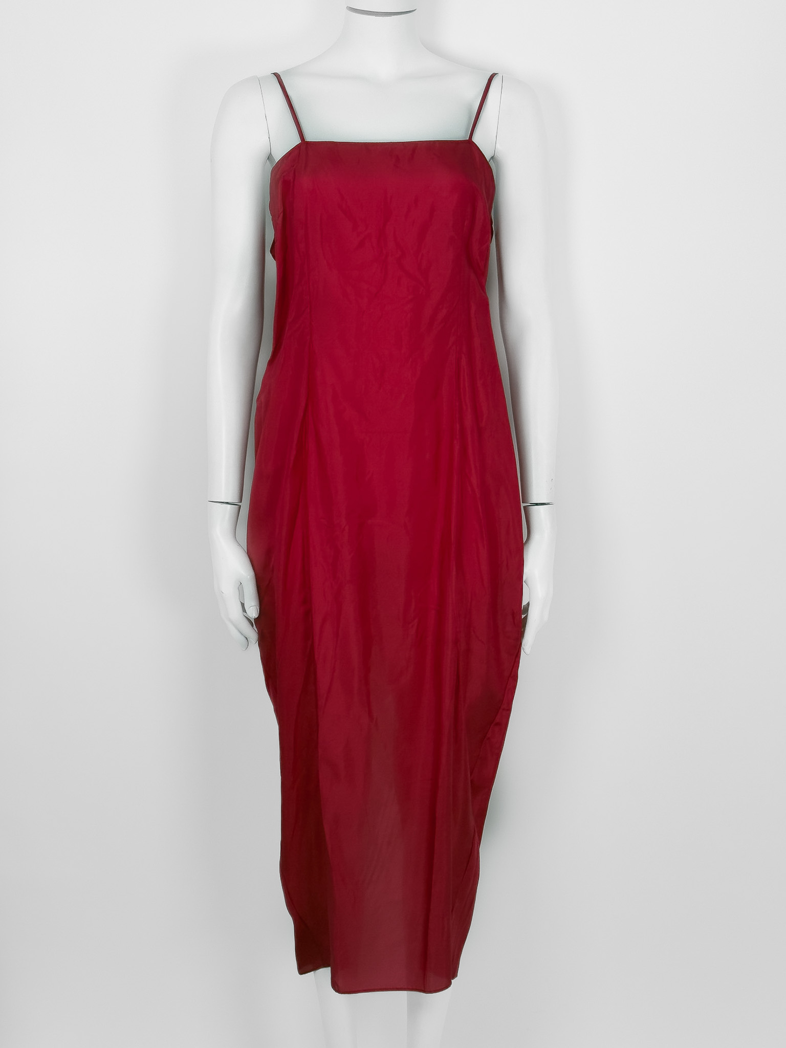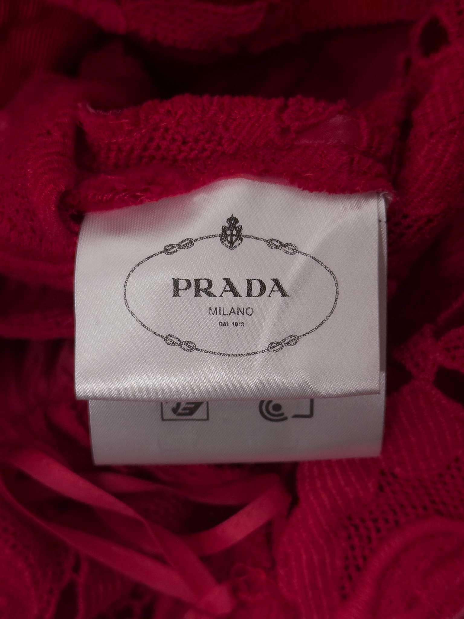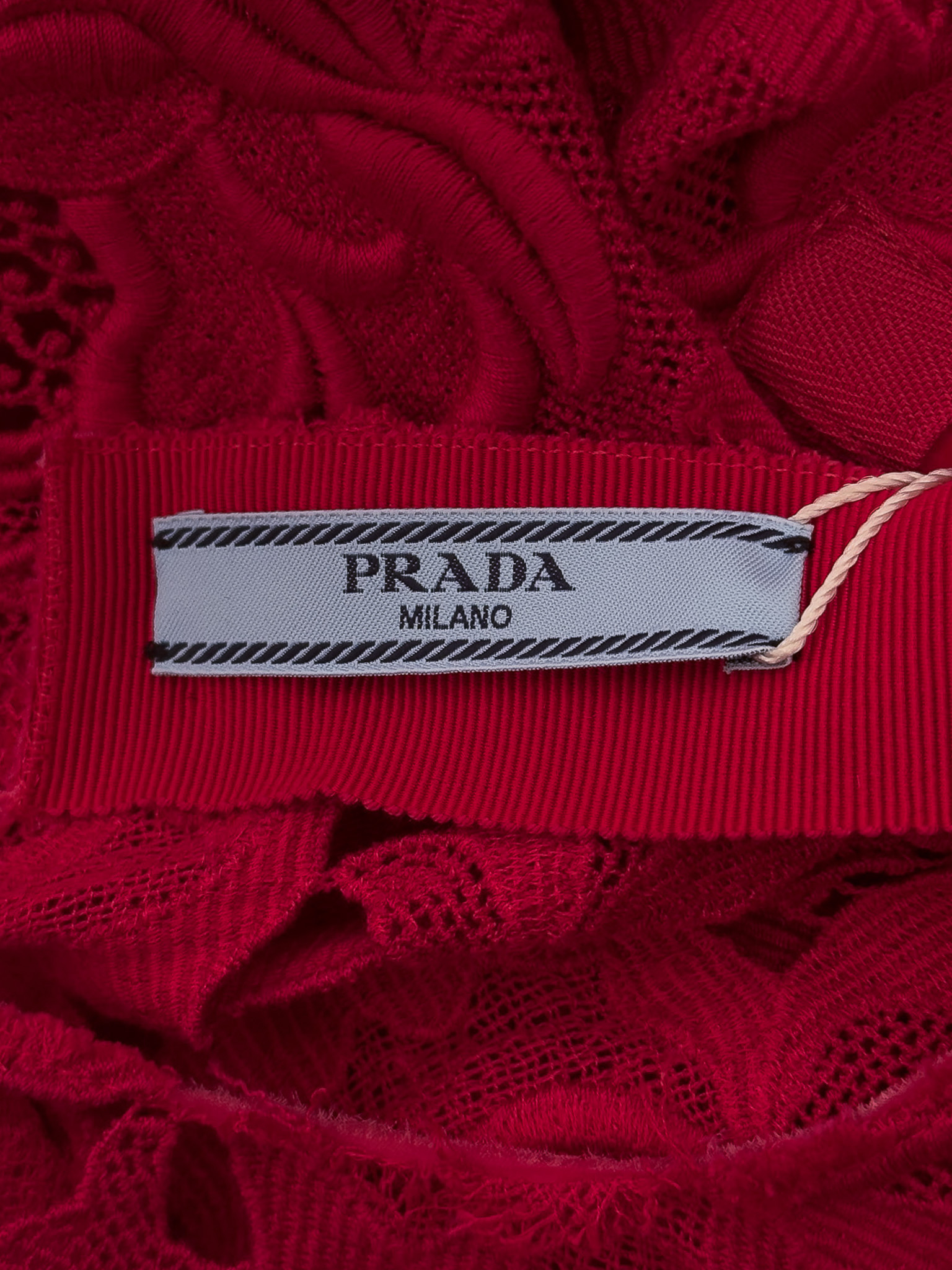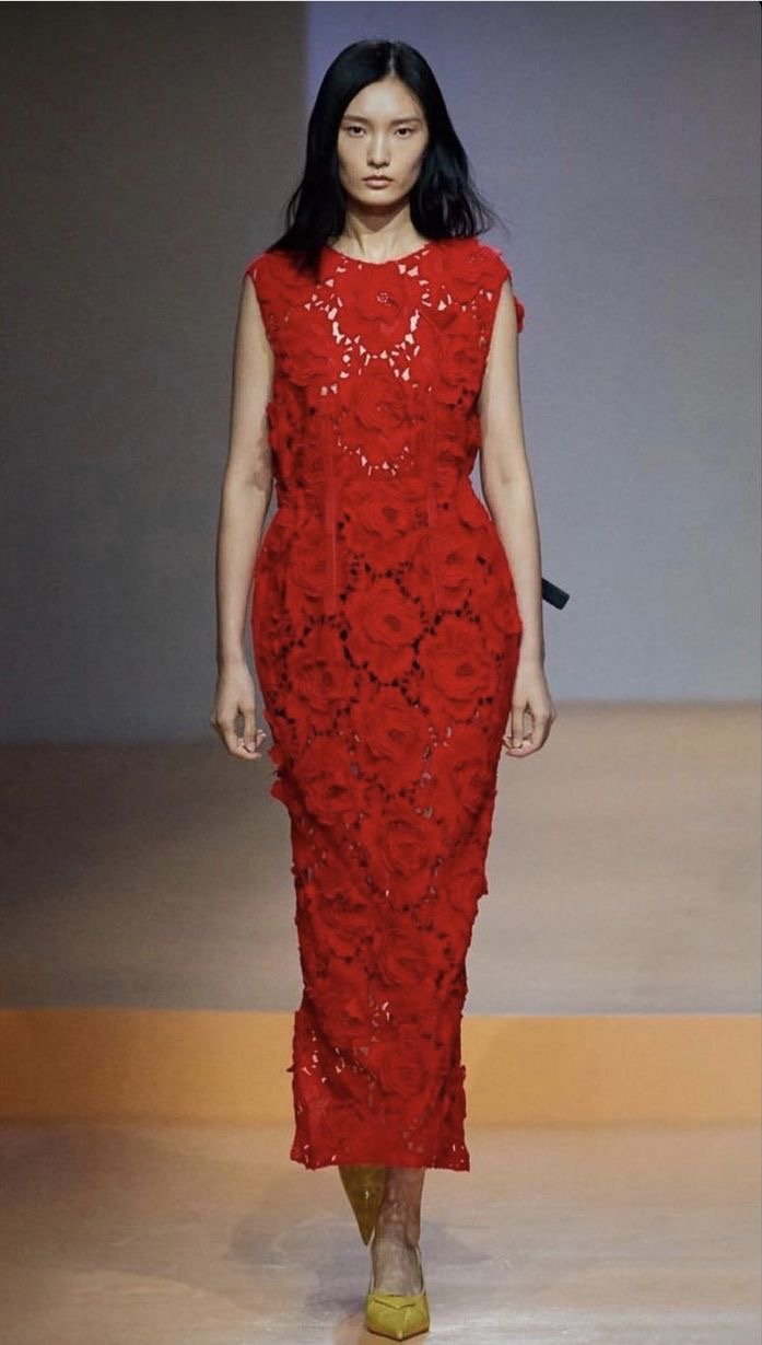 "Czerwona sukienka w motyw kwiatowy, ażurowa, bez rękawów, zaokrąglony dekolt, trójkątna naszywka w kształcie logo marki w okolicy biustu, czarny logowany pasek wykończony srebrną klamrą oraz szerokie szlufki w talii, rozcięcie w tylnej części, zapinana na duże kryte zatrzaski, poszewka na ramiączkach, w zestawie z metką. Stan bardzo dobry. Rozmiar z metki IT 46. Skład podszewki: 60% kupro z recyklingu, 40% jedwab. Wymiary sukienki: szerokość mierzona od pachy do pachy 54cm, długość całkowita 135cm."