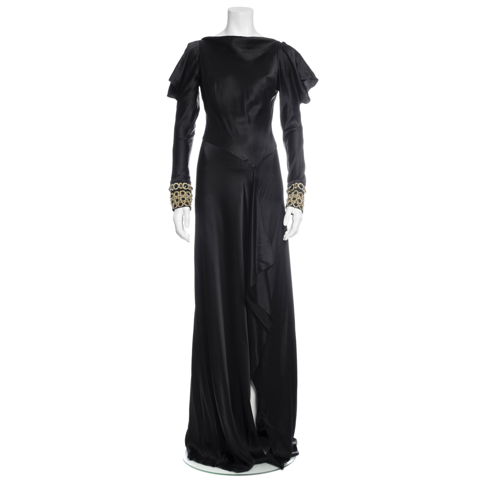 "czarna suknia z długim rękawem, złote zdobienia na rękawach, rozcięcia na ramionach, falbany, rozmiar S"