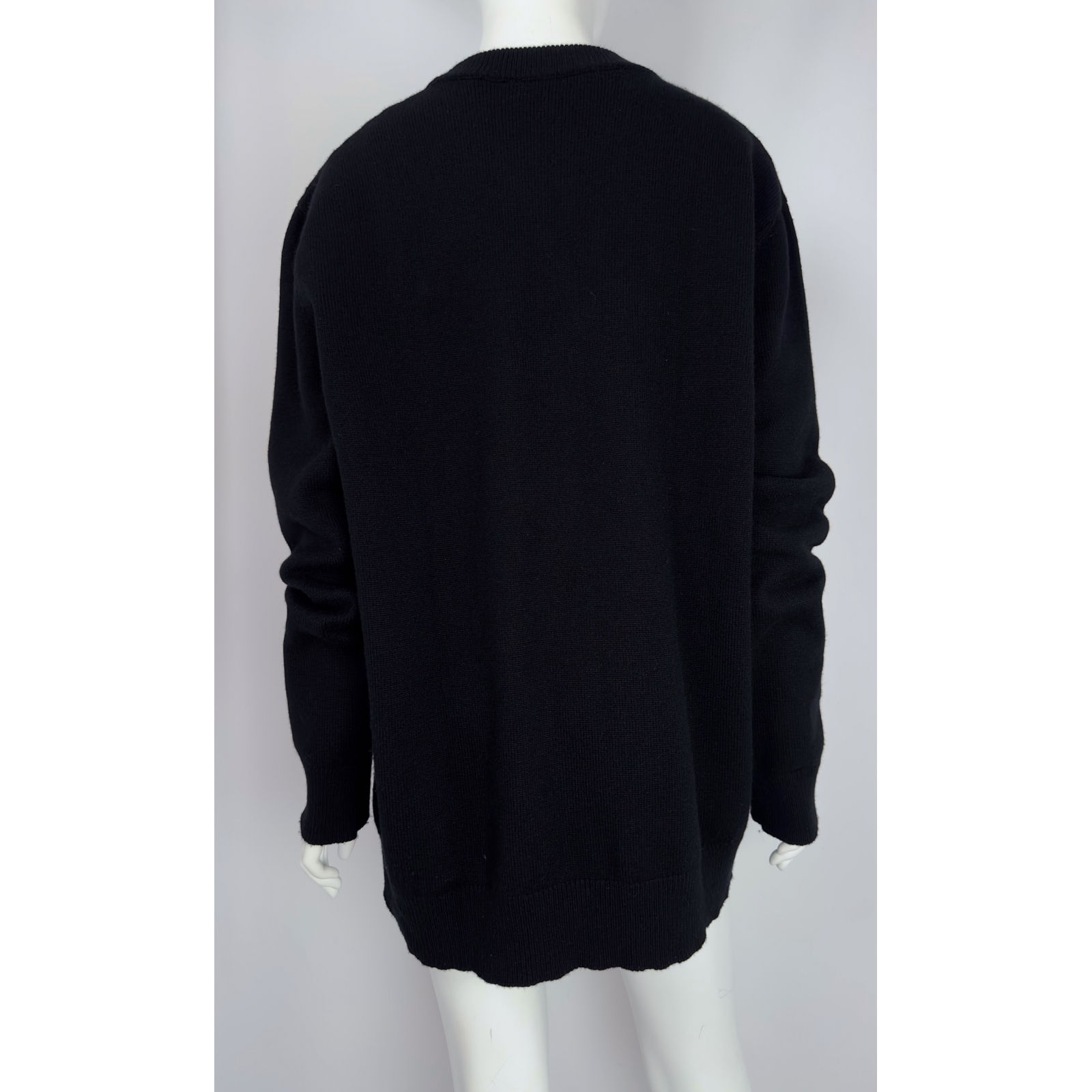 "Kaszmirowy czarny sweter, prosty krój, na przodzie wyszyta czerwono-kremowa grafika z sercem i napisem "L'Amore e Bellezza", zakończony ściągaczem, okrągły dekolt. Stan bardzo dobry. Rozmiar z metki 46. Skład: 100% kaszmir. Wymiary: szer. ramiona 52 cm, szer. biust 61 cm, dł całkowita 76 cm"
