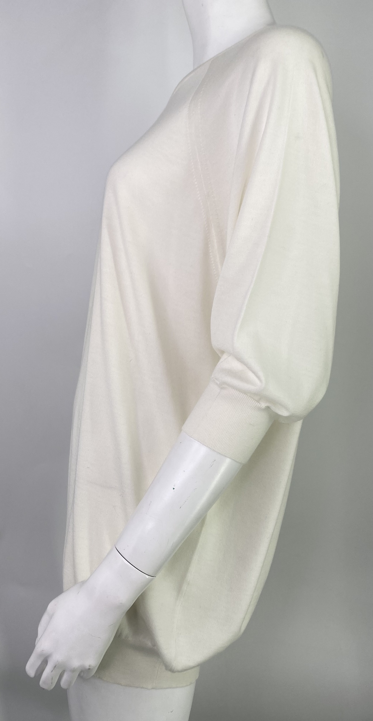"biały cienki sweter na krótki rękaw, nowy z metką, roz. L, skład: 100% kaszmir. Wymiary: szer. ramion 49 cm, szer. biustu 59 cm, szer talii 56 cm, dł. całkowita 74 cm, dł. rękawa 39 cm"