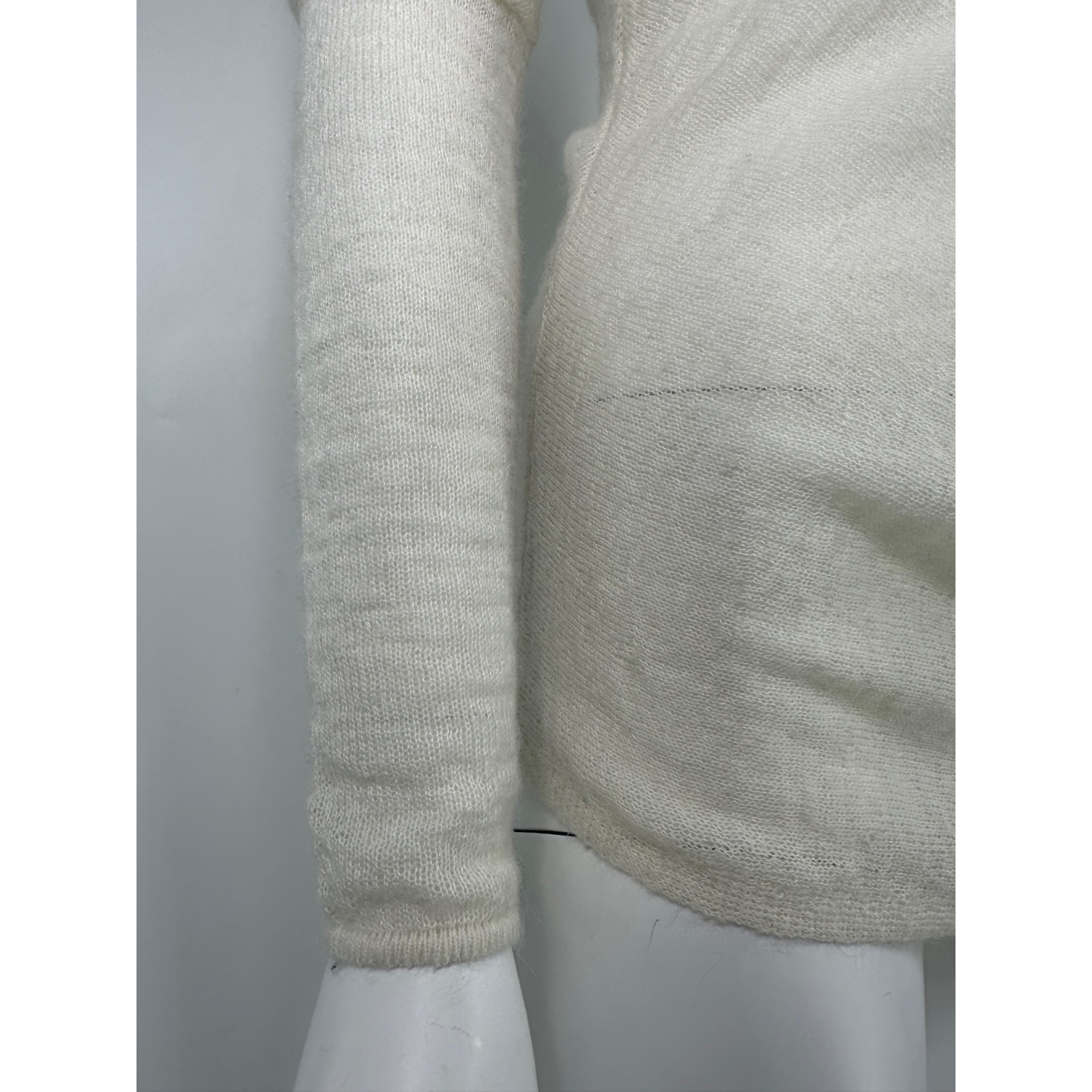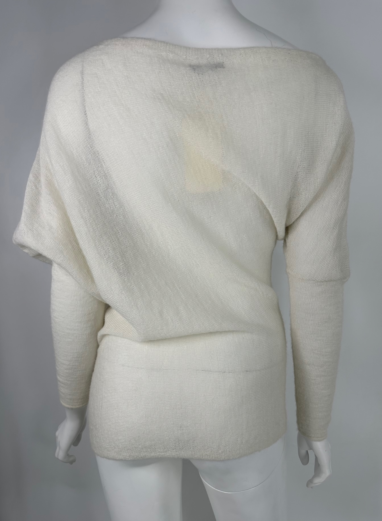 "sweter ecru z długim rękawem, asymetryczny. Rozmiar S. Skład: 45% acrylic, 43% wełna, 10% nylon. Wymiary: szer. ramion 64 cm, szer. biustu 50 cm, szer. talii 38 cm, dł. całkowita 74 cm, dł. rękawa 56 cm."