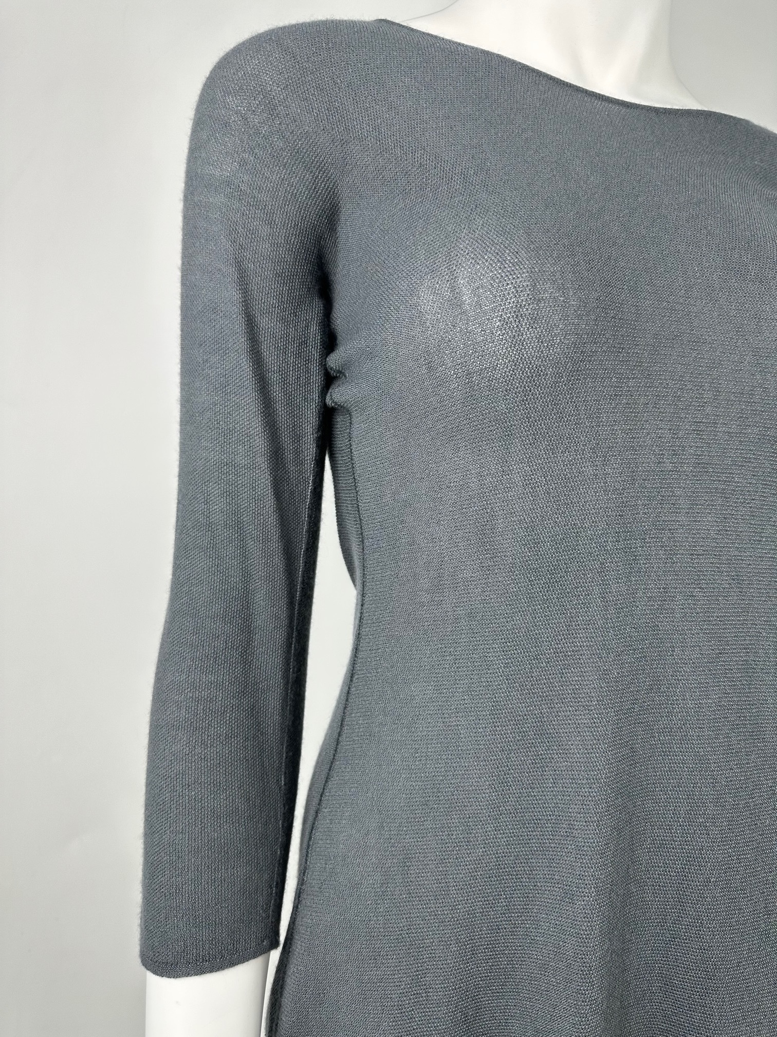 "szary transparentny sweterek z rękawem 3/4, łańcuszek z tyłu, rozmiar 40(it). Skład: 70% jedwab. Wymiary: szer. ramion 41 cm, szer. biustu 39 cm, szer. talii 33 cm, dł. całkowita 67 cm, dł. rękawa 39 cm."