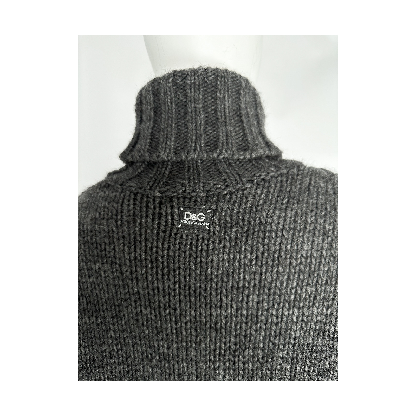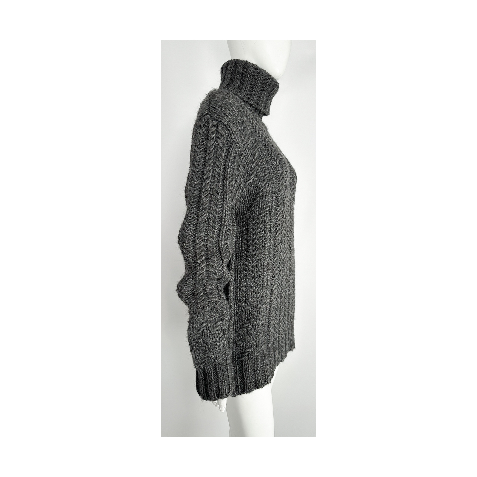"Grafitowy gruby sweter z domieszką wełny i alpaki, odwijany golf, lekko transparentny, dłuższy krój, bardzo długie proste rękawy, przyszyte logo marki z tyłu przy szyi. Rozmiar z metki XL. Skład: 45% wełna, 30% akryl, 25% alpaka. Wymiary: szerokość mierzona od pachy do pachy 54cm, długość rękawa 71cm, długość całkowita 71cm."