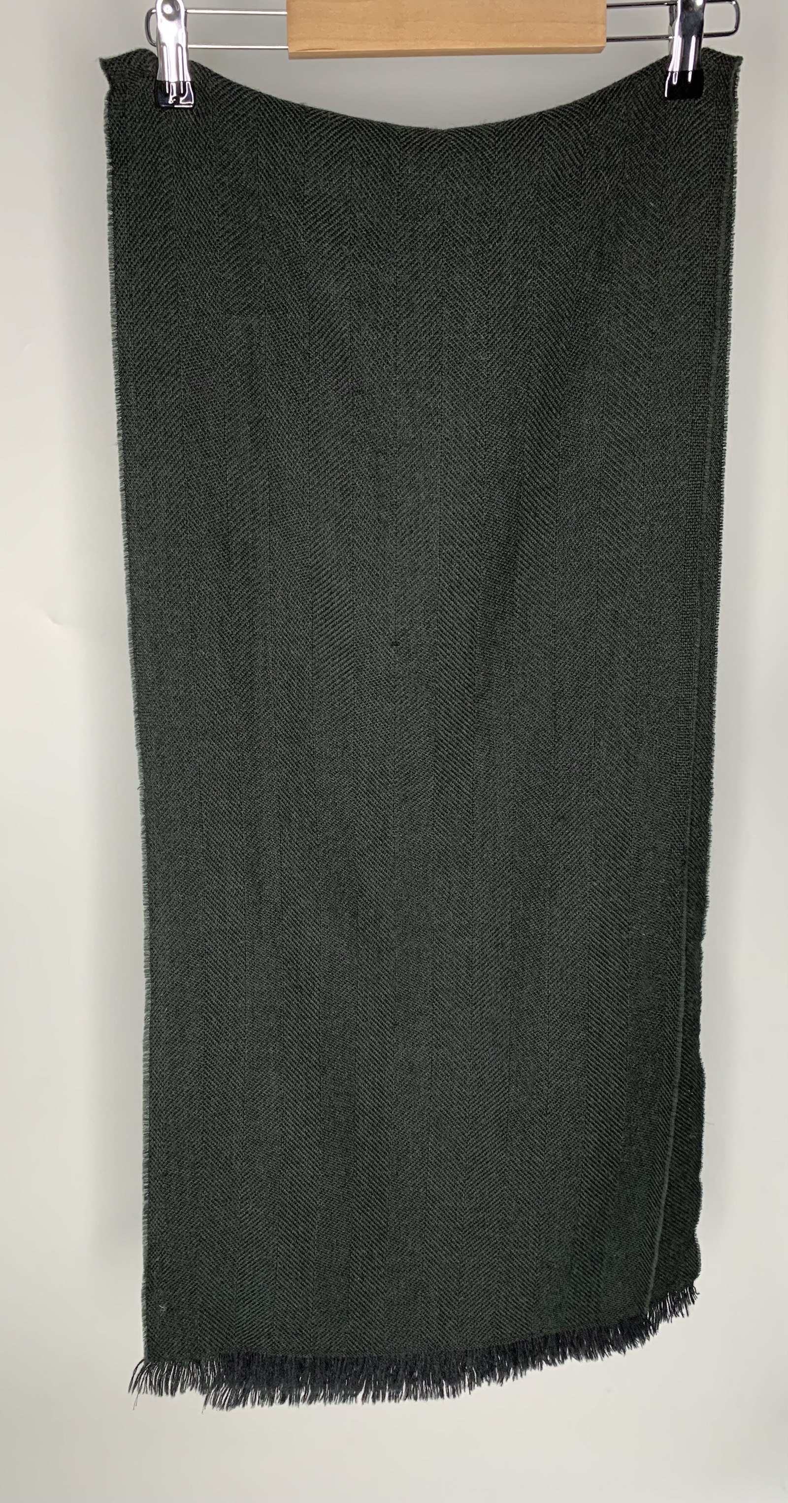 "Zielono-czarny szal z czarnym surowym wykończeniem, delikatnie zmechacony."