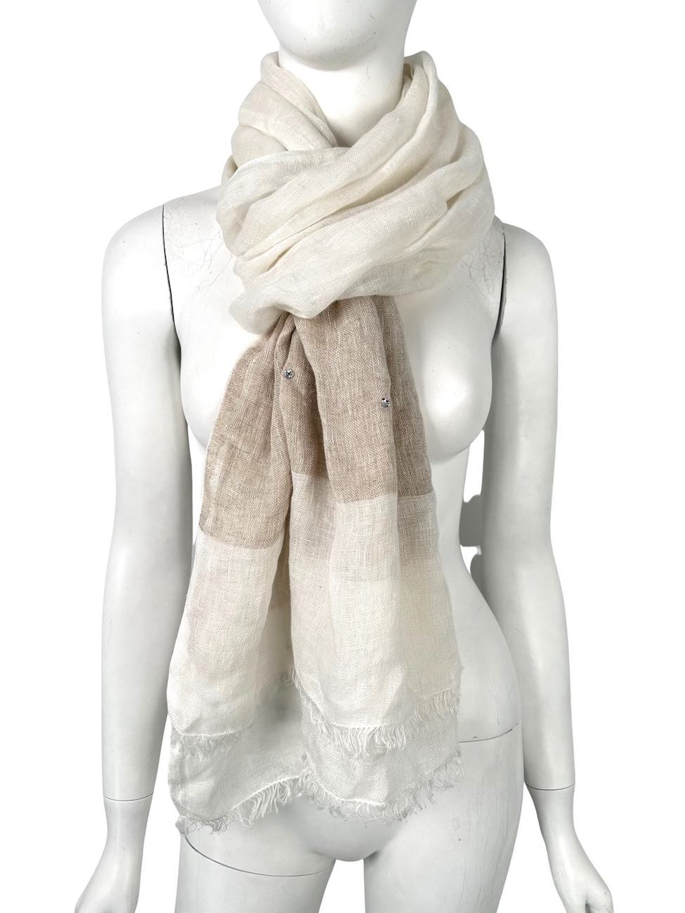 "Biało-beżowy lniany szal, transparentny, ozdobiony miejscami cyrkoniami, wykończenie z drobnych frędzli. Wymiary: dł.214 cm, szer. 66 cm."