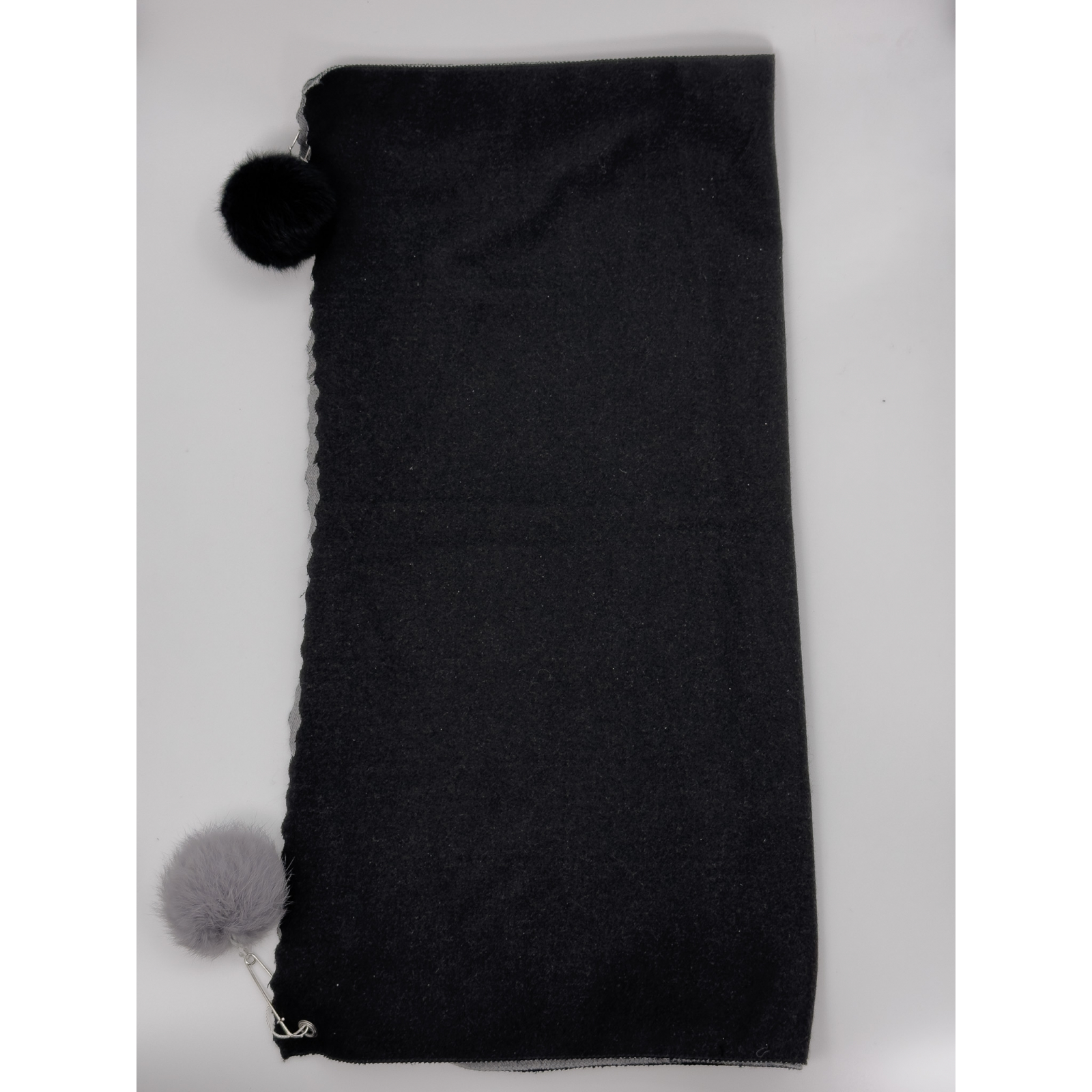 "Czarno-szary dwustronny szal ozdobiony dwoma pomponami z domieszką wełny oraz kaszmiru w składzie, długi prostokątny kształt. Skład: 10% wełna, 20% kaszmir, 70% wiskoza. Wymiary: 186cm x 66cm."