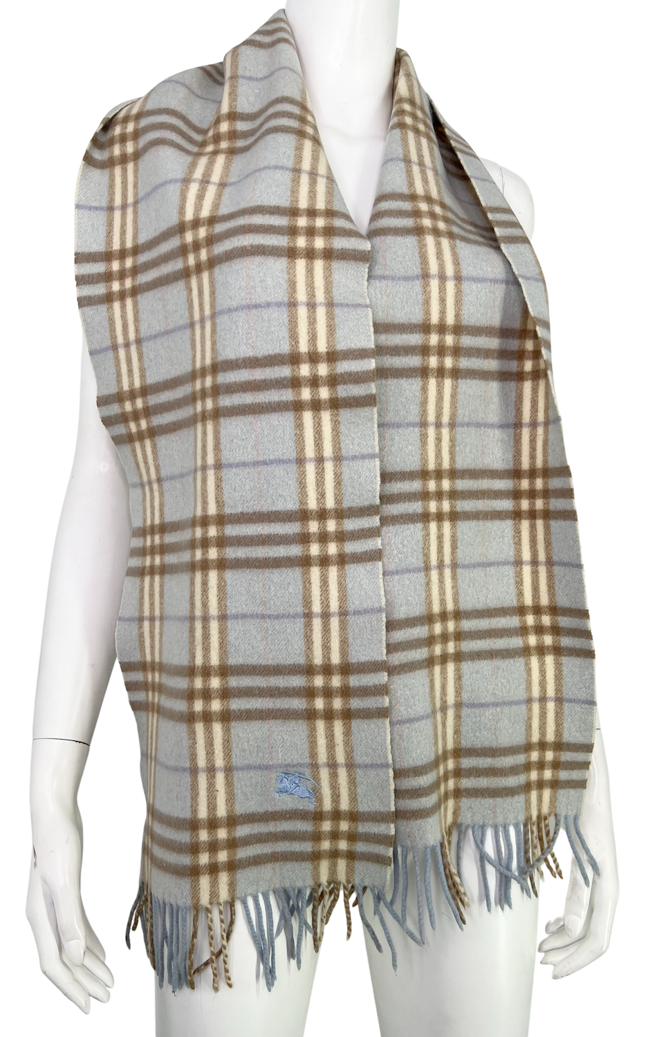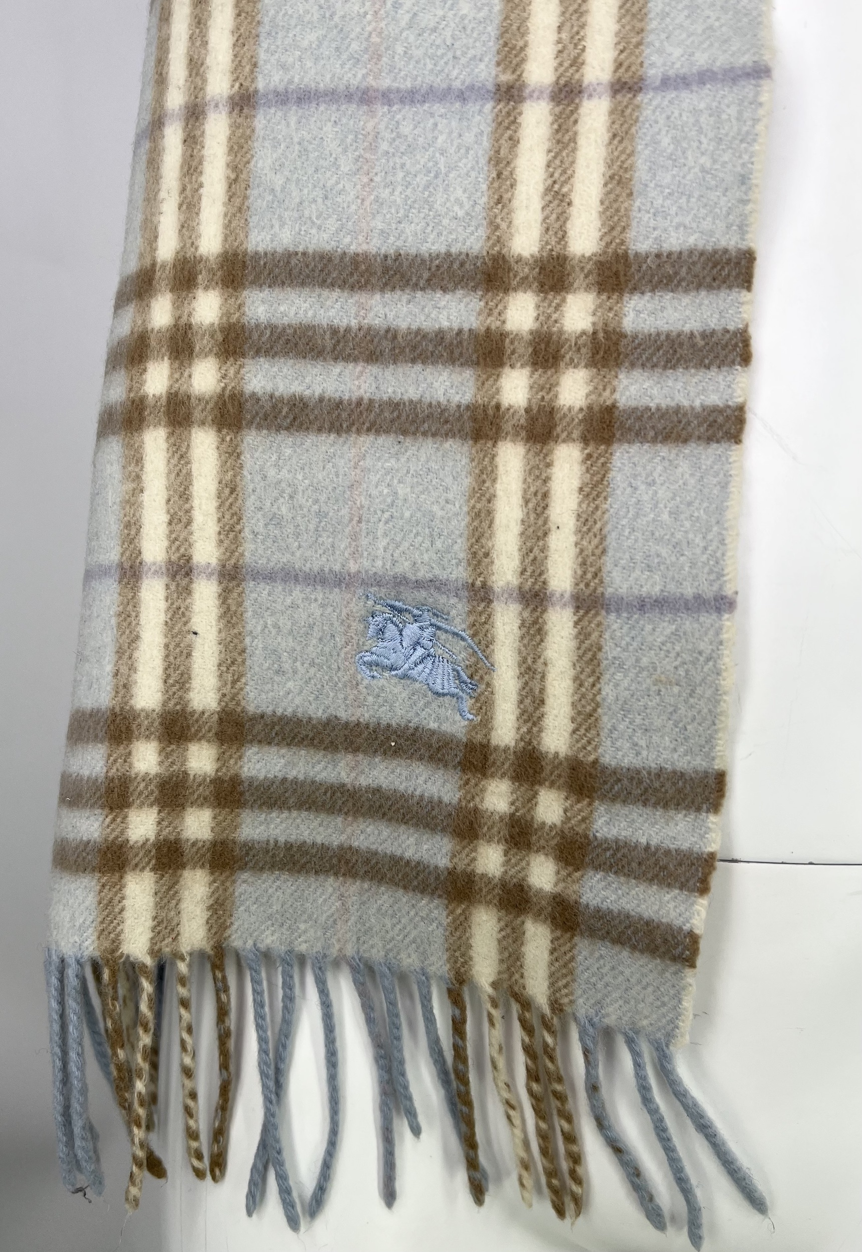 "szalik wełniany w kratkę błękitno-beżowo-fioletowo-ecru, skład: 52% lamb wool, 43% merino, 5% kaszmir, wymiary: szerokość 26 cm, długość 158 cm"