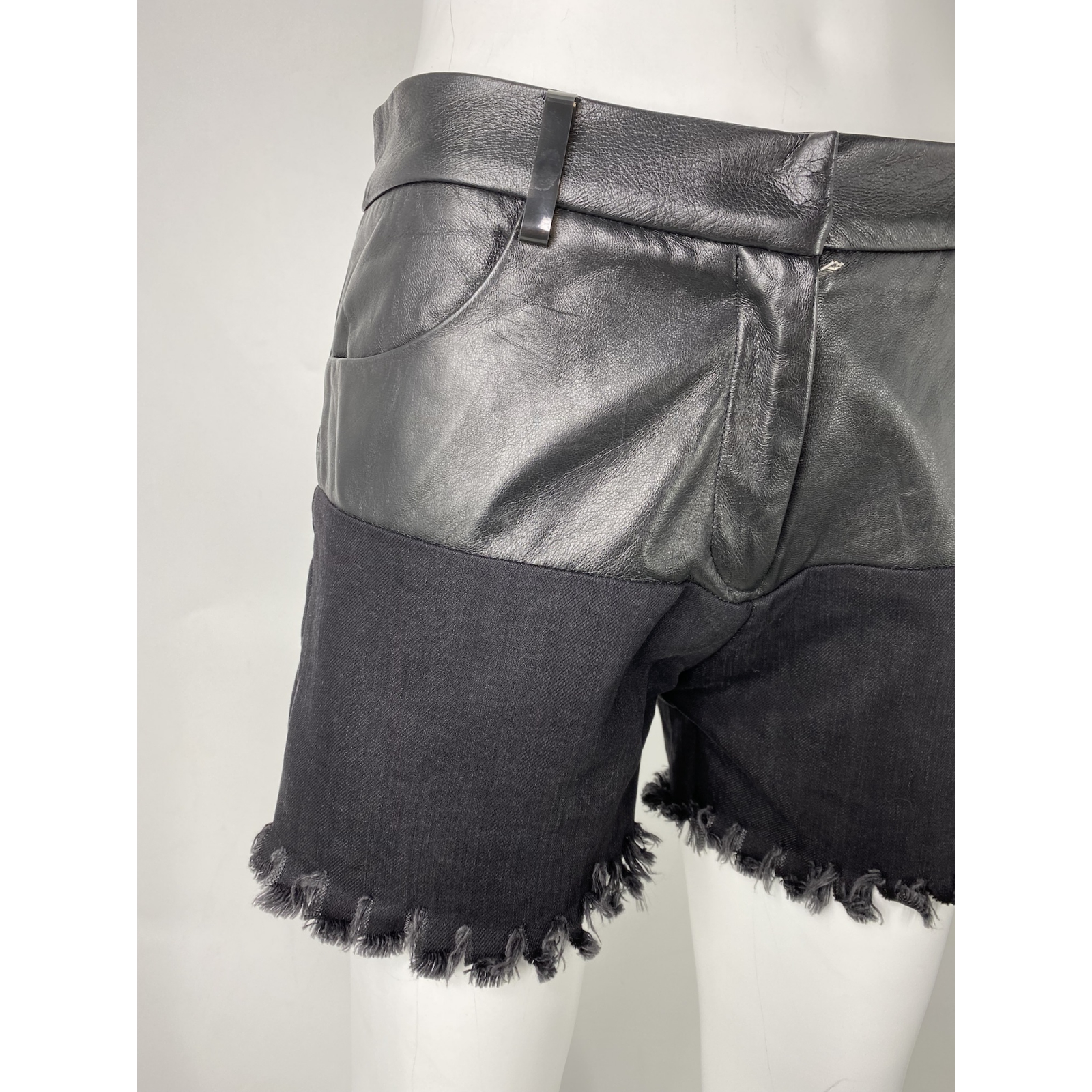 "szorty czarne letnie, skóra łączona z jeansem. Naturalna skóra i bawełna. Wymiary: szer. pas 39 cm, szer. biodra 45 cm, dł. całkowita 31 cm."