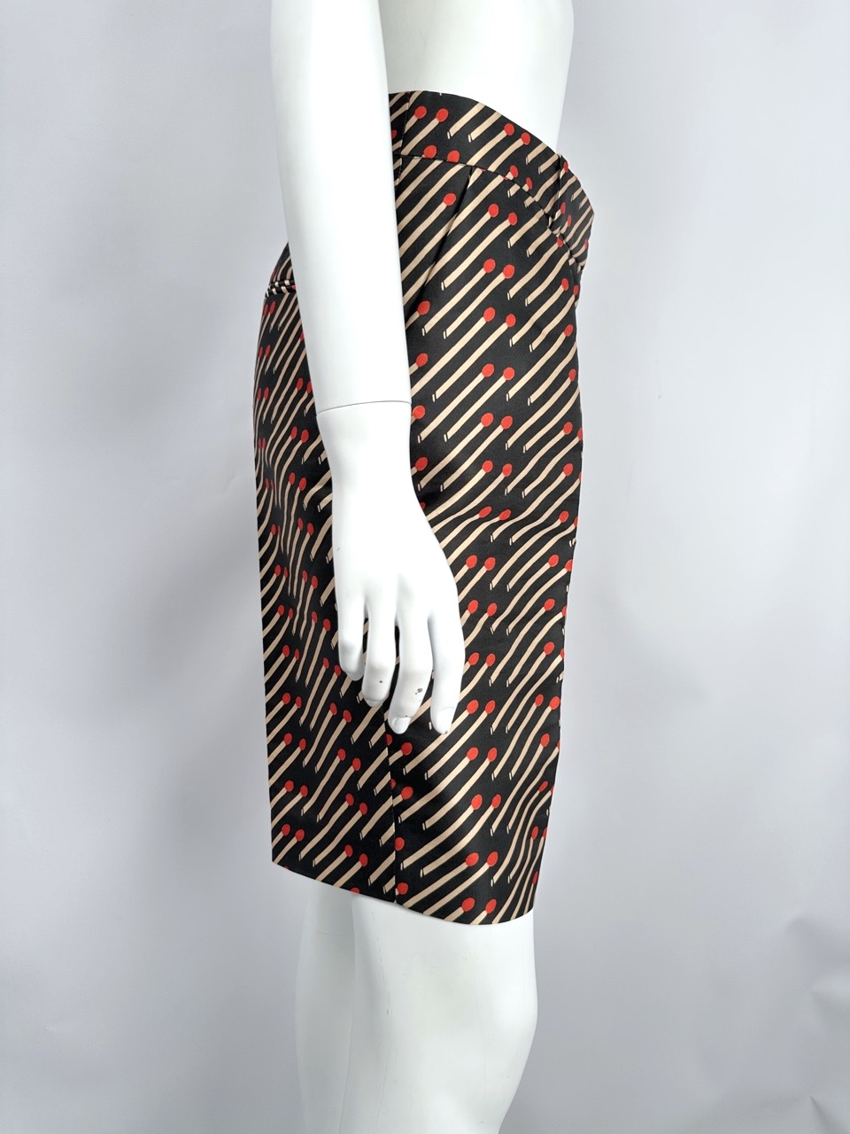 "czarne szorty we wzór zapałek beżowo czerwony. Rozmiar 38. Nowe z metką. Skład: 84% poliester, 16% jedwab. Wymiary: szer. talii 36 cm, szer. bioder 46 cm, dł. całkowita 51 cm."