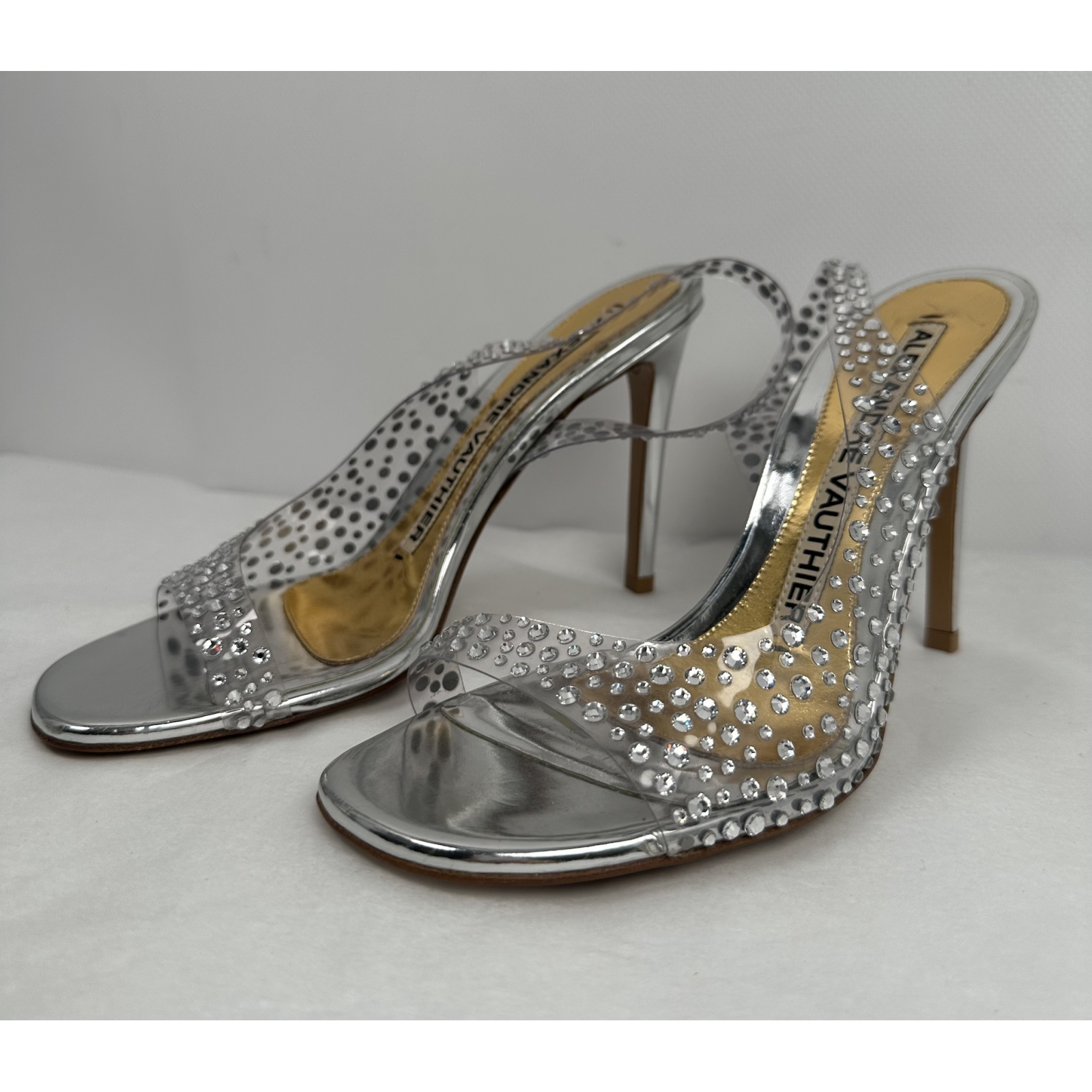 "srebrne szpilki wysadzane ozdobnymi kryształami, odkryta pięta oraz palce, złoto - srebrna wkładka. Rozmiar 37. Stan bardzo dobry, obcasy posiadają drobne rysy."