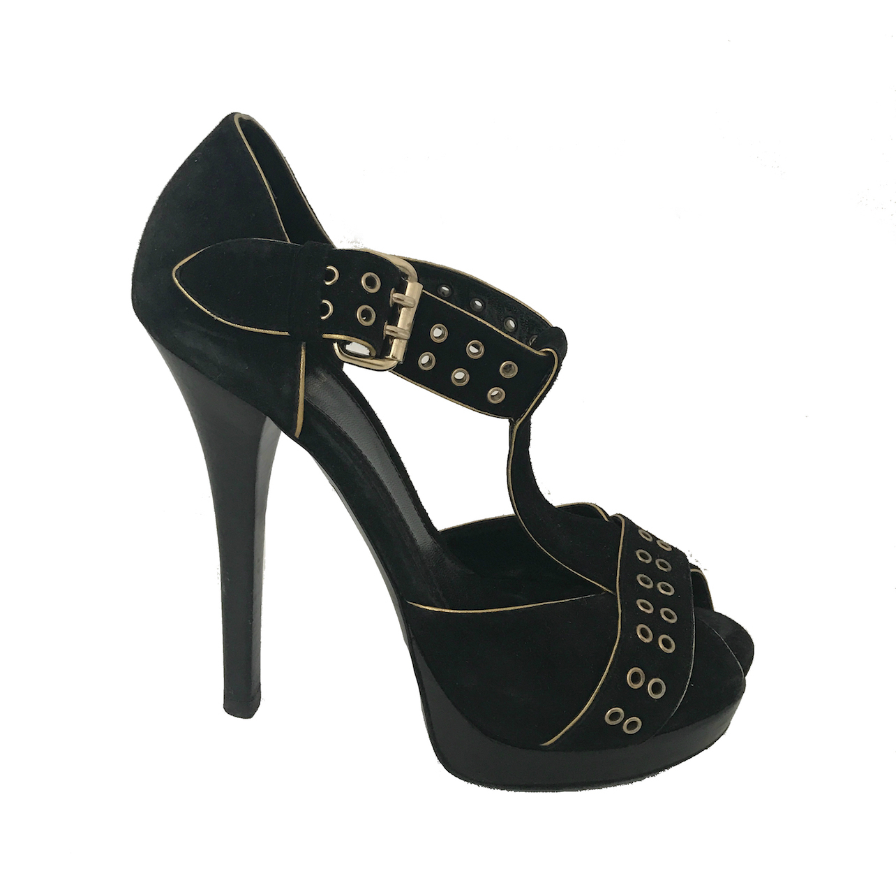 "Buty w kolorze czarnym, na platformie, zamszowe, złote kółeczka z lamówką. Rozmiar 38,5"