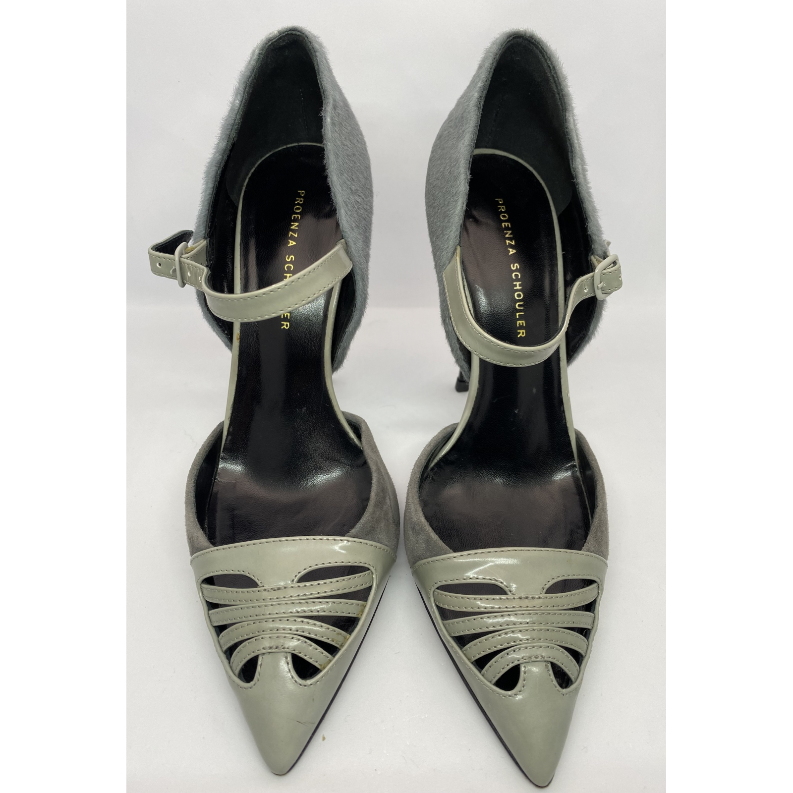 "szare szpilki z włosia, zapinane w kostce, nosek ażurowy do szpica, lakierowany z przeszyciami, czarna podeszwa. Rozmiar 39. Wys.obcasa 12 cm."
