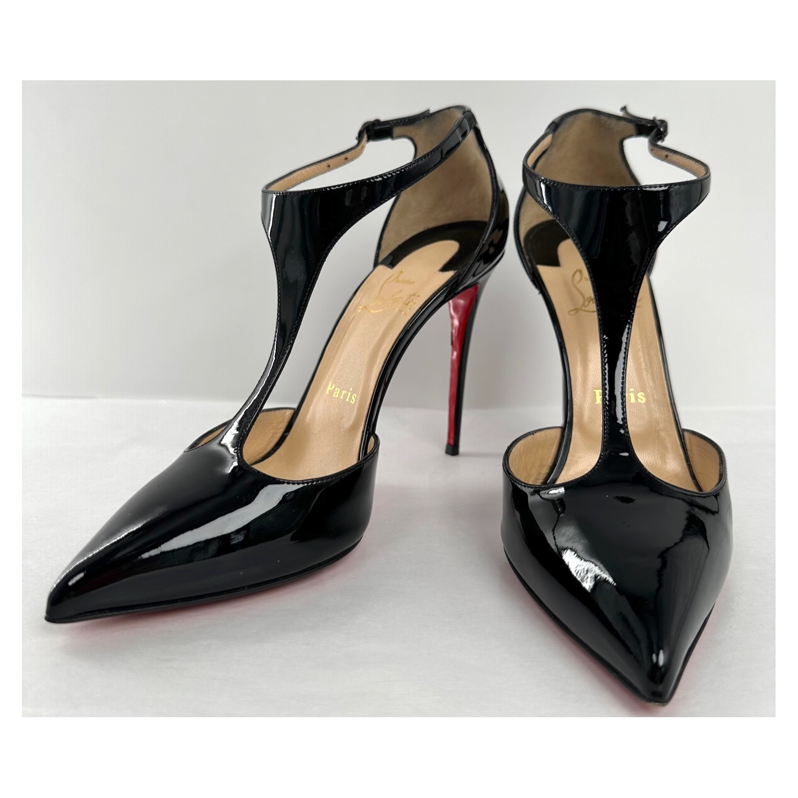 "czarne lakierowane szpilki, pasek przez śródstopie, zapinane na kostce, nosek w szpic, używane, stan bardzo dobry, przetarcia na podeszwie. Rozmiar 38, wys. obcasa 11 cm."