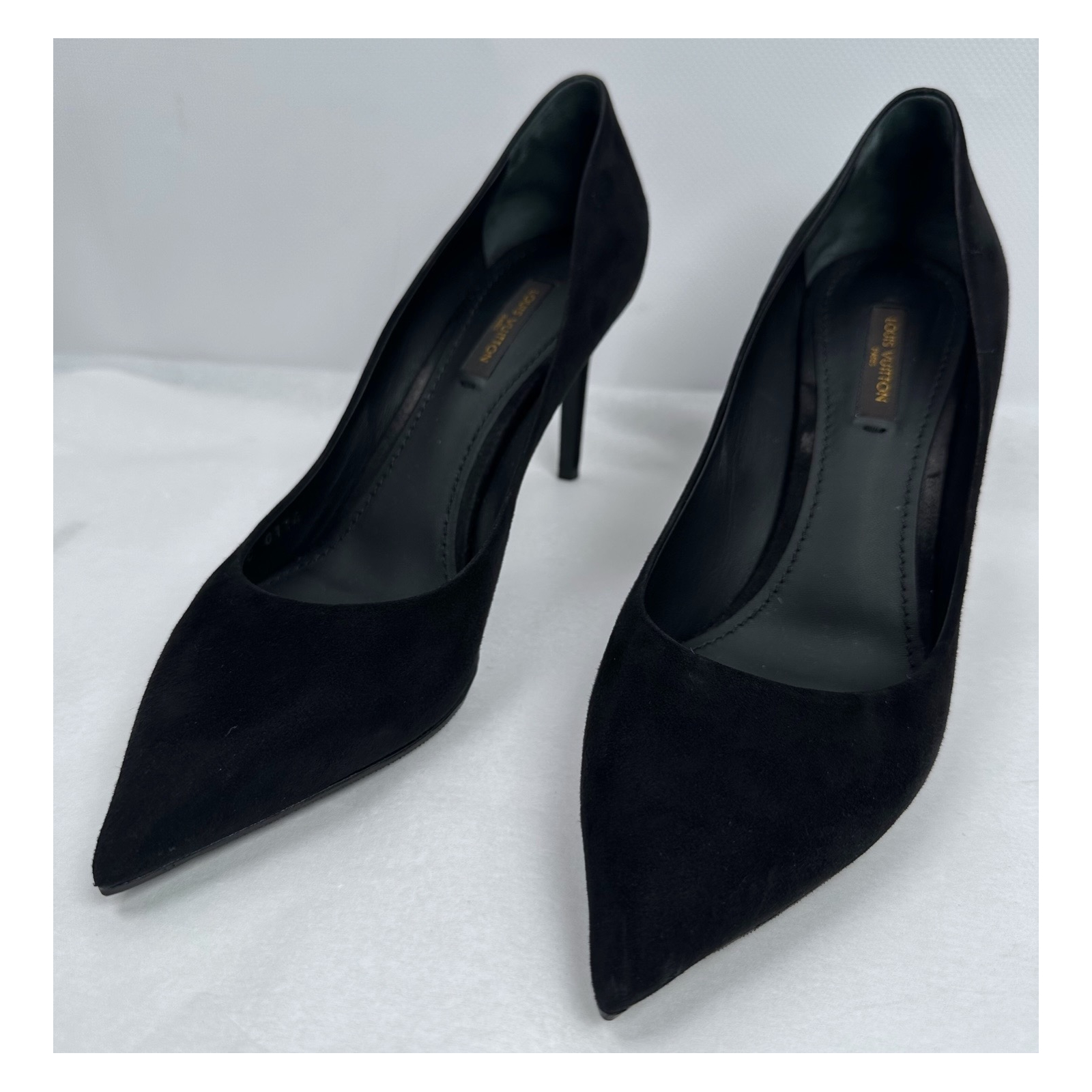 "Czarne obcasy z zamszowej skóry. Mają nosek wyciągnięty w szpic. Tył obcasa ozdobiony jest metalowym paskiem z tłoczonym logo. Rozmiar: 38. Dł wkładki: 24 cm. Skład: cholewka: 100% skóra zamszowa wkładka: 100% skóra naturalna, podeszwa: tworzywo sztuczne. Wys. obcasa: 8 cm."