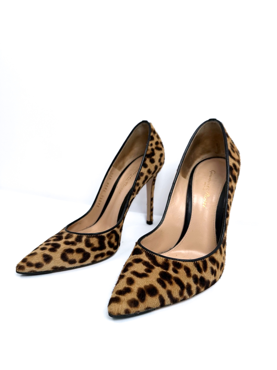 "Szpilki w motyw brązowej panterki, wykonane z naturalnej skóry, nosek w szpic, wykończone czarną skórą. Stan bardzo dobry, wytarta podeszwa oraz okolice pięt od wewnętrznej strony. Rozmiar 37,5."