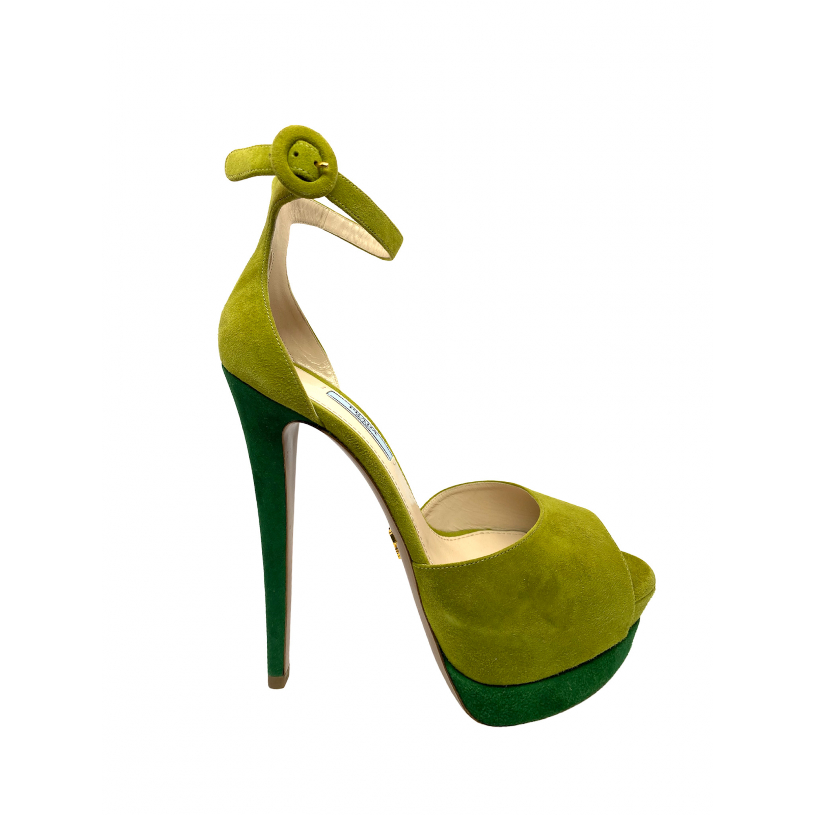 "Zielone, zamszowe bardzo wysokie szpilki zapinane w kostce, odkryte palce. Stan bardzo dobry. Rozmiar 39. Wysokość obcasa 16 cm, wys. koturny 4 cm"