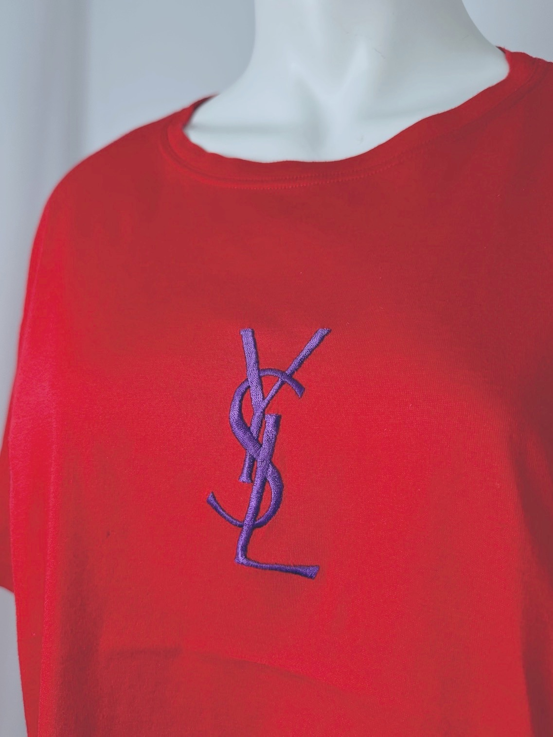 "Czerwony T-shirt z logo. Ma prosty krój. Wyróżnia go duże, wyszywane fioletową nicią logo marki, umiejscowione pod mostkiem. Stan bdb, widoczne naturalne zużycie materiału. Brak metki z rozmiarem. Skład: 100% bawełna. Wymiary: dł. całkowita (mierzona od linii karku): 65 cm., szer. (mierzona od pachy do pachy): 55 cm."