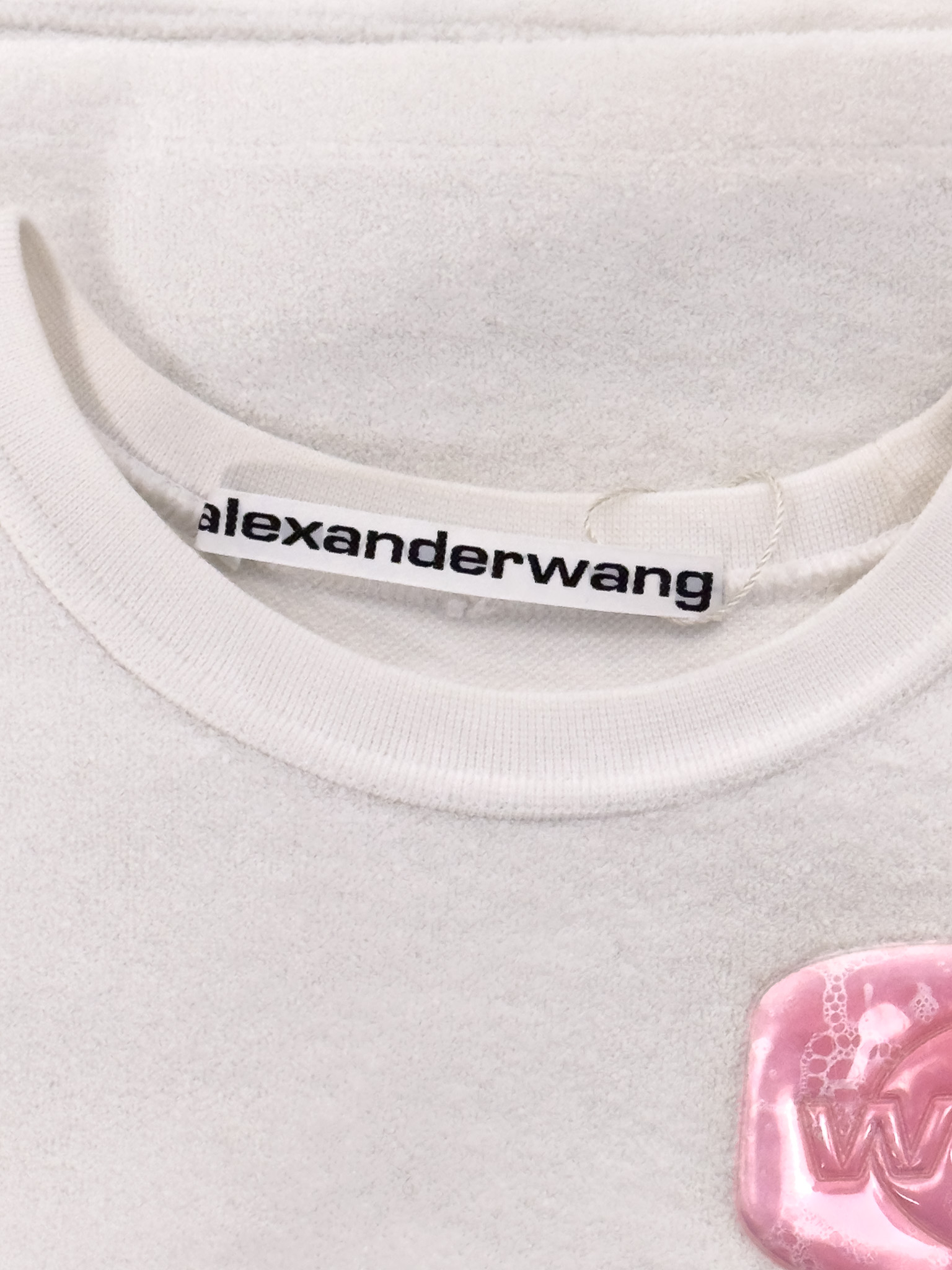 "Biały t-shirt wykonany z tkaniny frotte, ozdobiony różowym logo w okolicy biustu, zaokrąglony dekolt wykończony ściągaczem, krótszy, prosty krój. Stan bardzo dobry. Rozmiar z metki S. Skład: 84% bawełna, 9% poliester, 5% poliamid, 2% elastan. Wymiary: szerokość mierzona od pachy do pachy 44cm, długość całkowita 49cm."