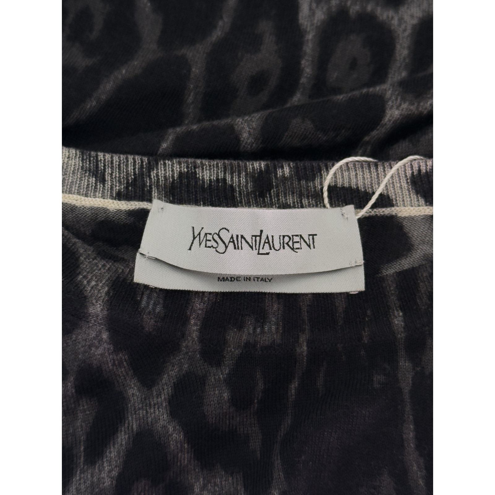 "Szaro-czarny t-shirt w motyw pantery z domieszką kaszmiru, wełny oraz jedwabiu w składzie, szare logo marki w centralnej części, cienki materiał, zaokrąglony dekolt wykończony prążkowanym ściągaczem. Rozmiar z metki L. Skład: 35% kaszmir, 35% wełna dziewicza, 30% jedwab. Wymiary: szerokość mierzona od pachy do pachy: 49cm, długość całkowita: 59cm."