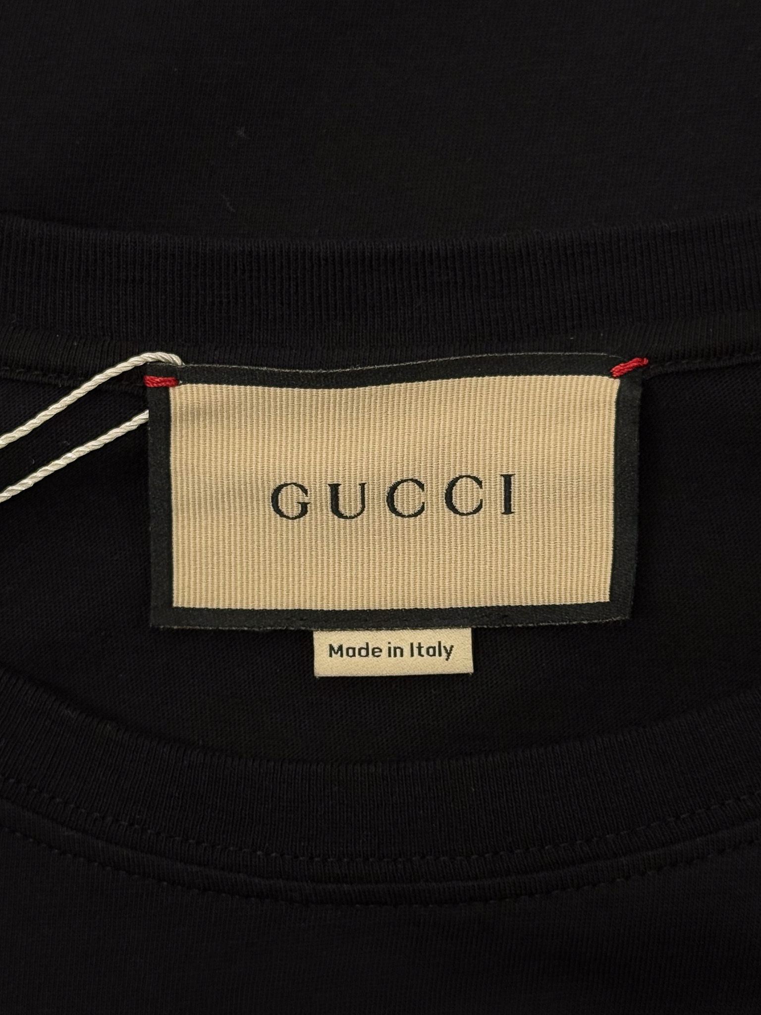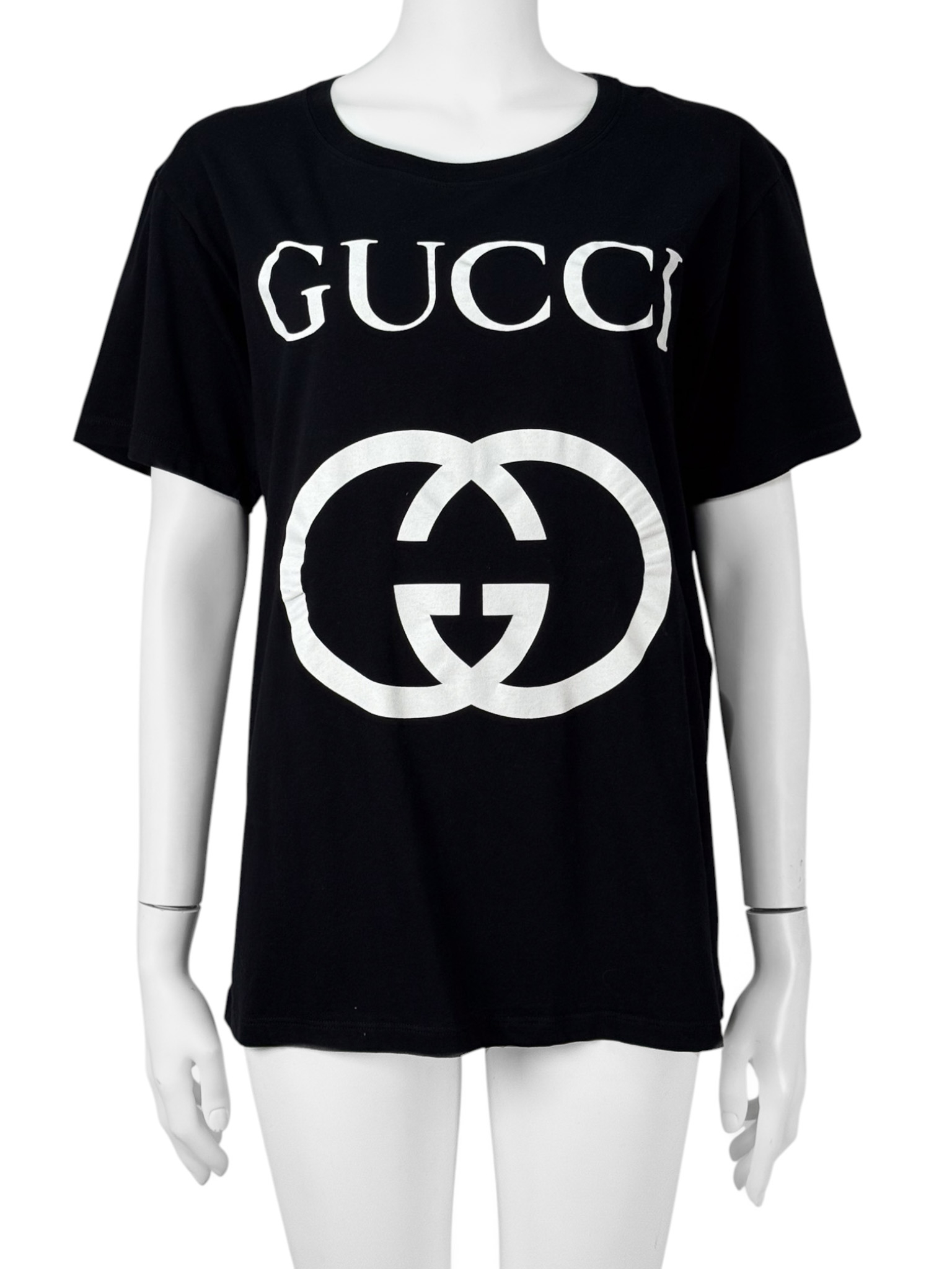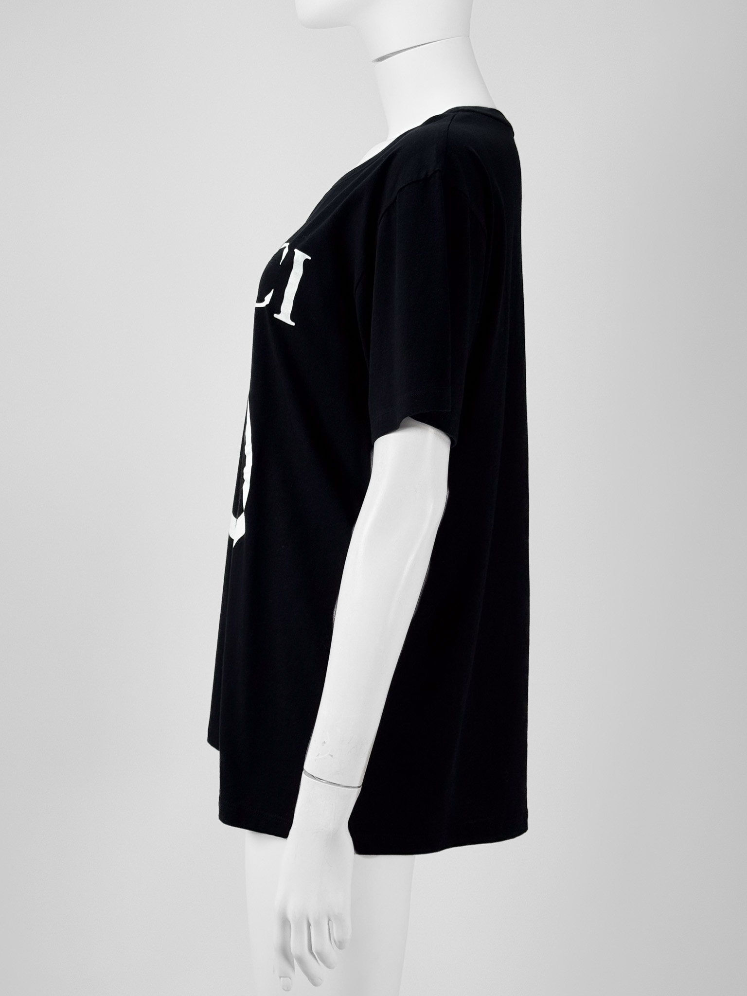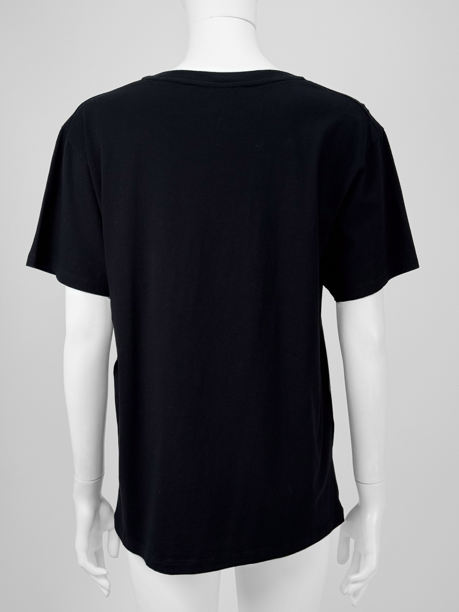 "Czarny bawełniany t-shirt ozdobiony białym logo na przodzie, krój oversize, zaokrąglony dekolt wykończony ściągaczem. Rozmiar z metki M. Skład: 100% bawełna. Wymiary: szerokość mierzona od pachy do pachy 55cm, długość całkowita 69cm."