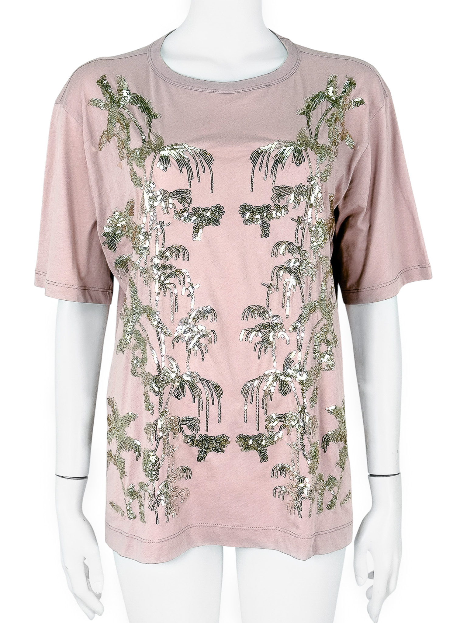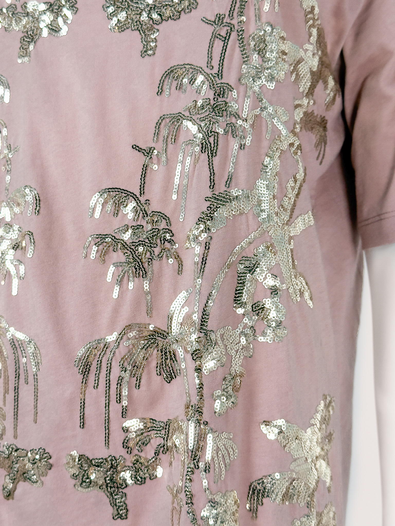 "Bawełniany t-shirt w kolorze bladego różu ozdobiony grafiką palm wysadzanych złotymi cekinami, prosty krój, zaokrąglony dekolt wykończony ściągaczem. Stan dobry, posiada plamę w okolicy biustu. Rozmiar z metki S. Skład: 100% bawełna. Wymiary: szerokość mierzona od pachy do pachy 55cm, długość całkowita 64cm."