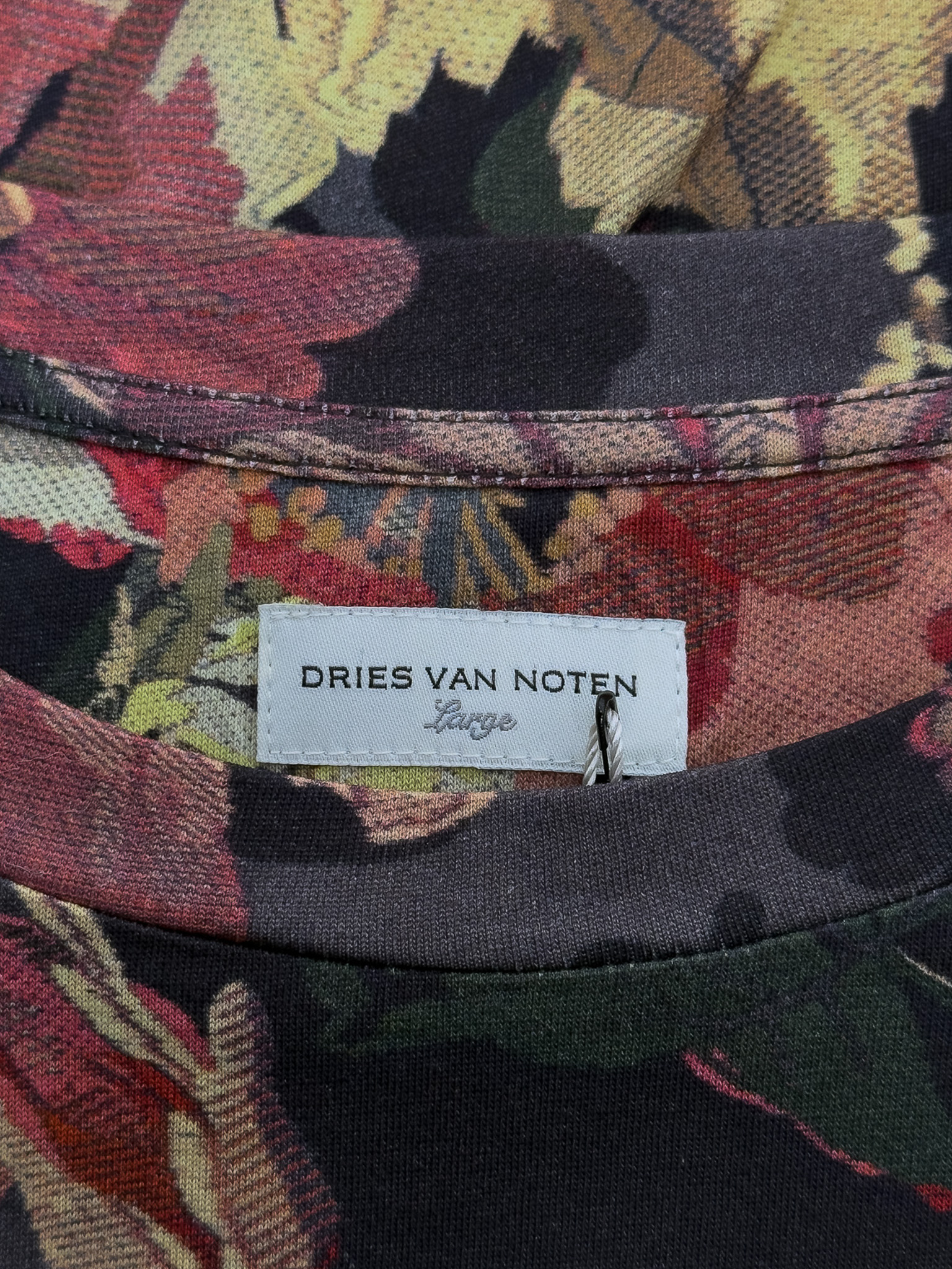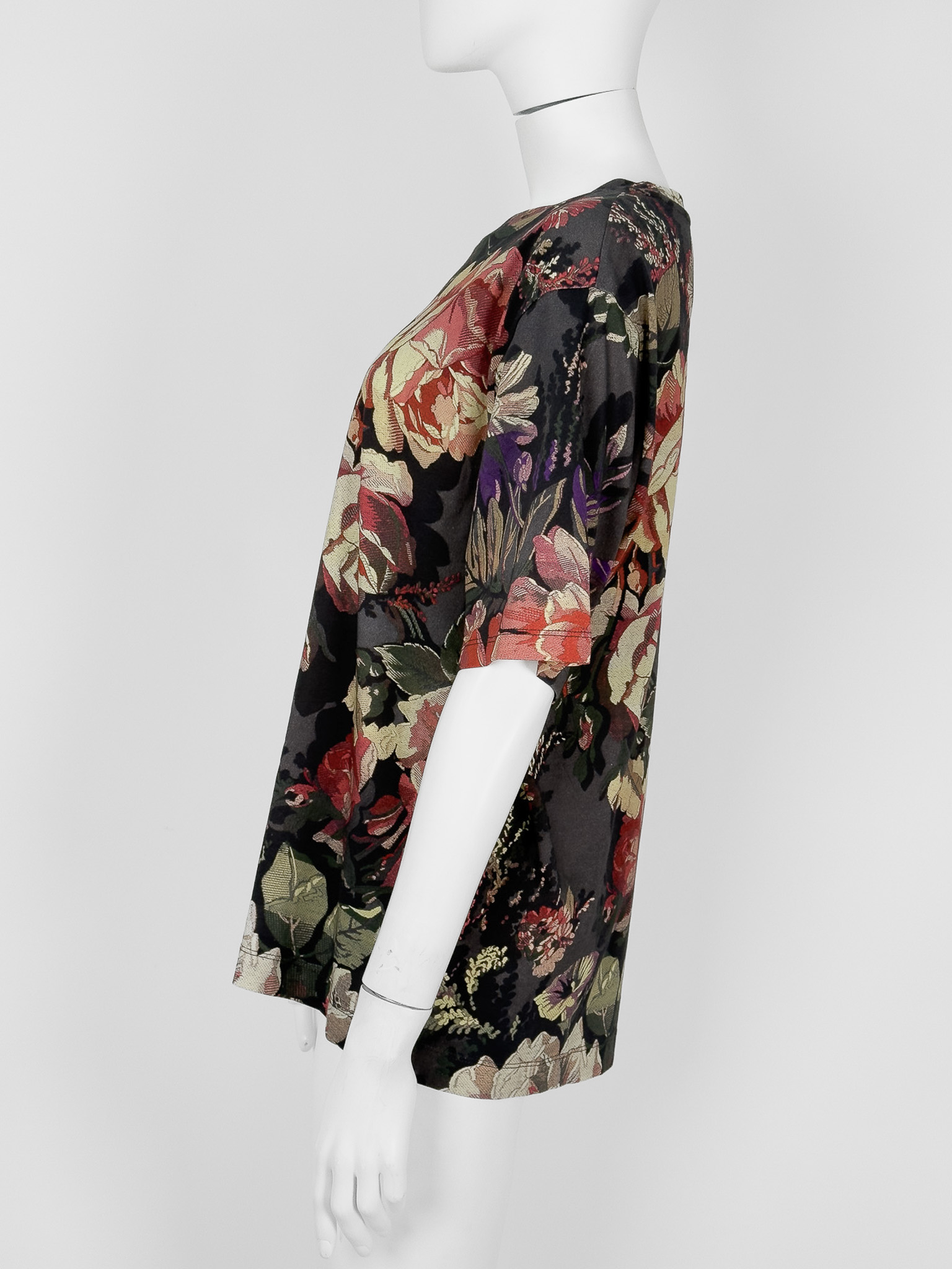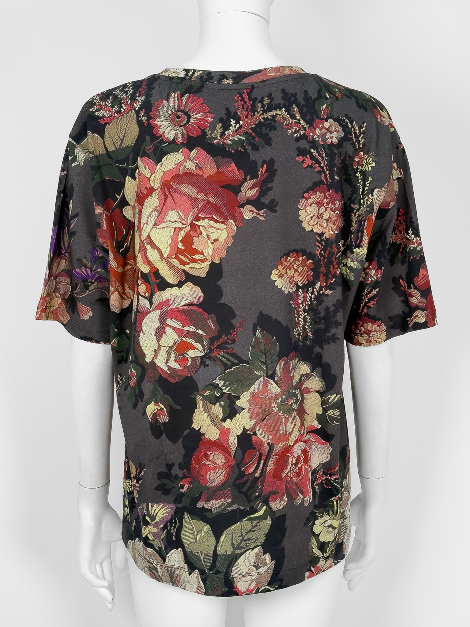 "Ciemnoszary bawełniany t-shirt ozdobiony różowo-fioletowo-czerwoną grafiką kwiatów, prosty krój, zaokrąglony dekolt. Stan bardzo dobry. Rozmiar z metki L. Skład: 100% bawełna. Wymiary: szerokość mierzona od pachy do pachy 59cm, długość całkowita 66cm."