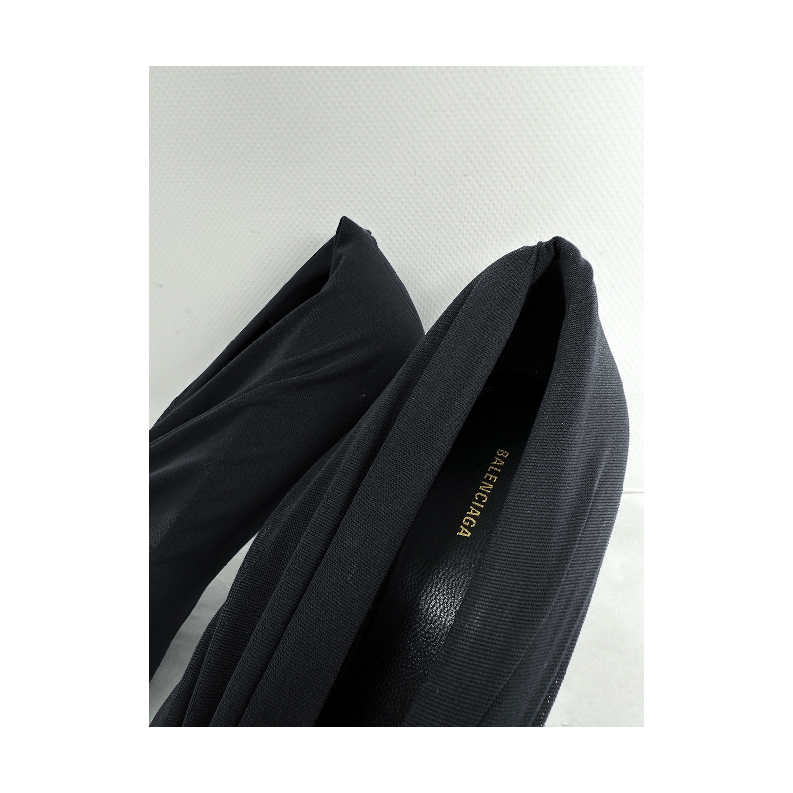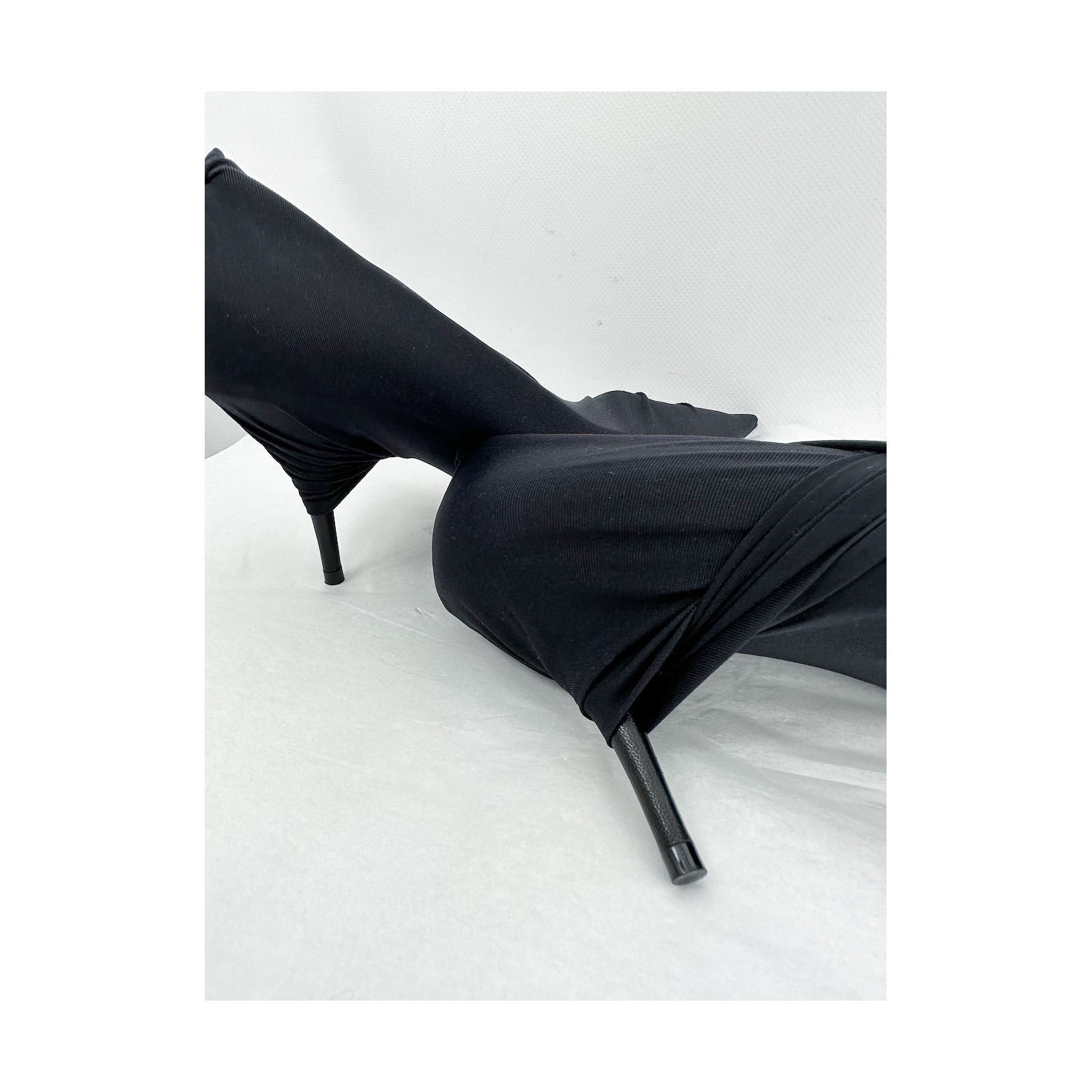 "Czarne tekstylne szpilki, model: Balenciaga Knife Cloth Heels, ozdobione marszczoną tkaniną w górnej części, nosek w szpic, czarny obcas, czarne skórzane wnętrze oraz zamszowy niebieski zapiętek, w zestawie wymienne fleki, worek przeciwkurzy oraz pudełko, używane. Stan bardzo dobry, delikatnie przetarte podeszwy. Rozmiar 38."