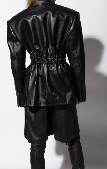 "Czarna skórzana marynarka, taliowana, dłuższy krój, oversize, duże poduszki na ramionach, marszczenie w talii wykończone trzema ściągaczami, zapinana na trzy logowane guzki, dekolt w szpic, szpiczasty kołnierz, proste rękawy, dwie duże kryte kieszenie umieszczone na wysokości bioder po bokach, rozpinane mankiety, używana. Stan dobry, delikatne rysy na skórze. Rozmiar z metki 34. Skład: 100% skóra; podszewka: 55% wiskoza, 35% nylon, 10% jedwab."