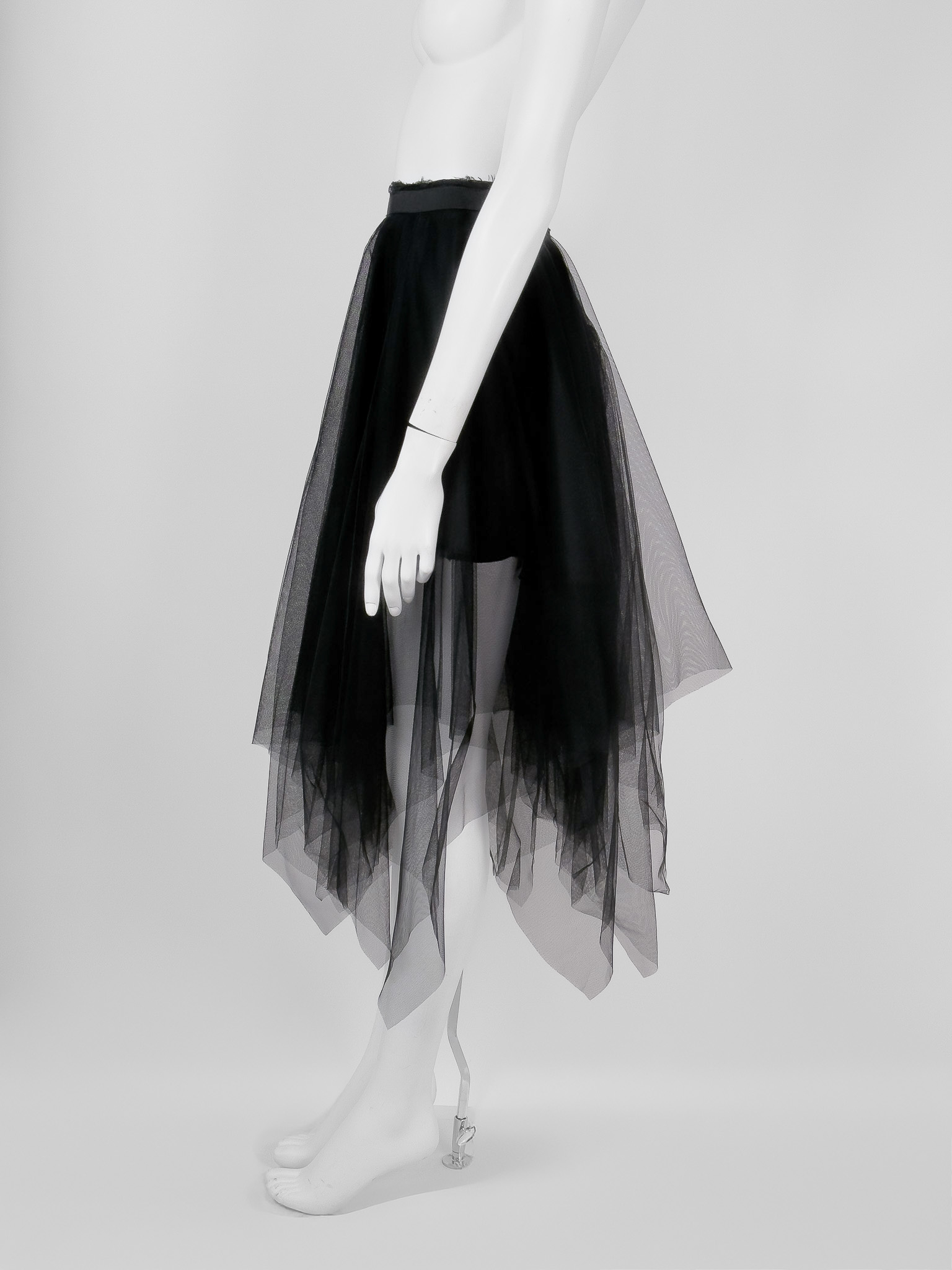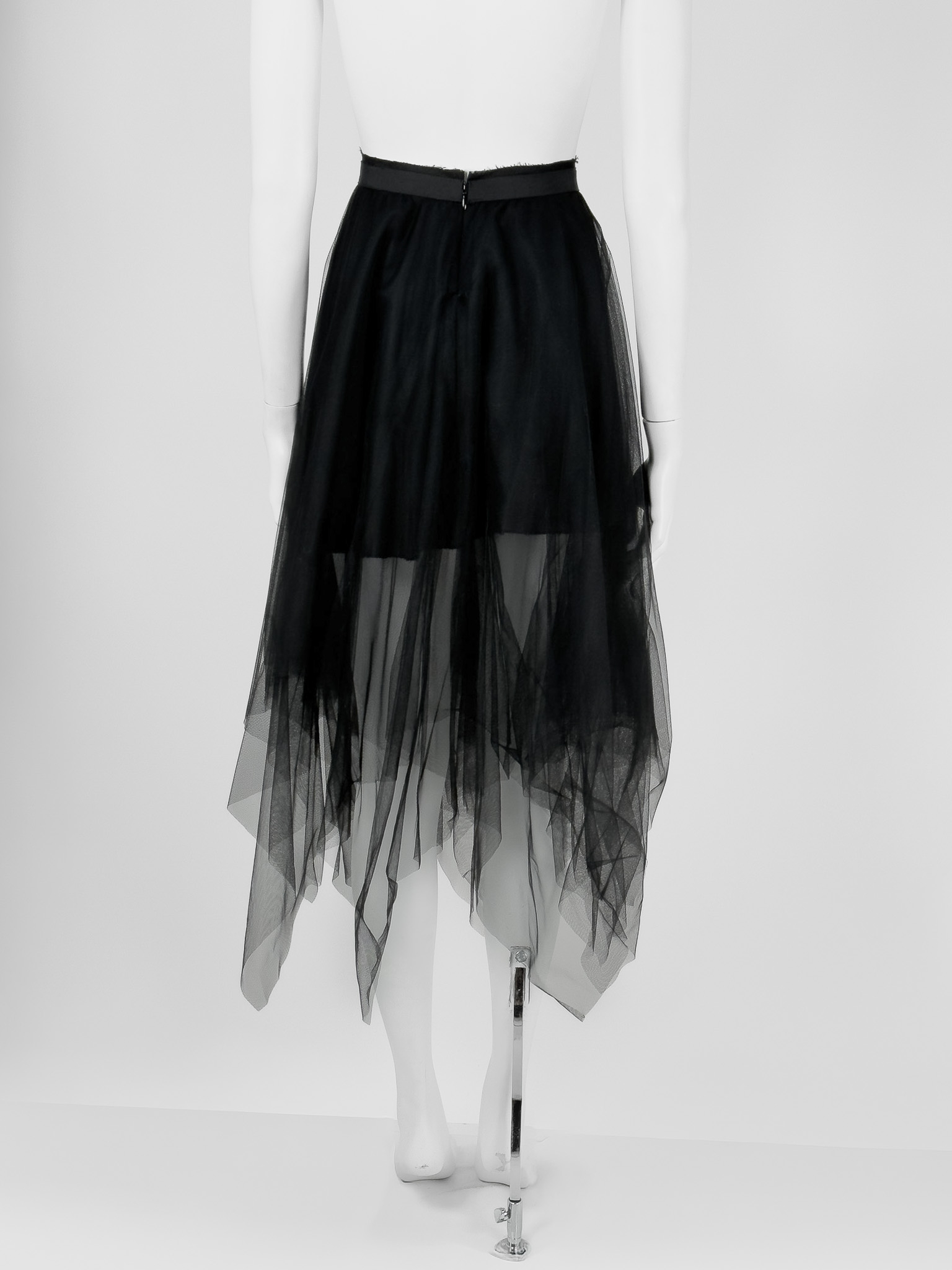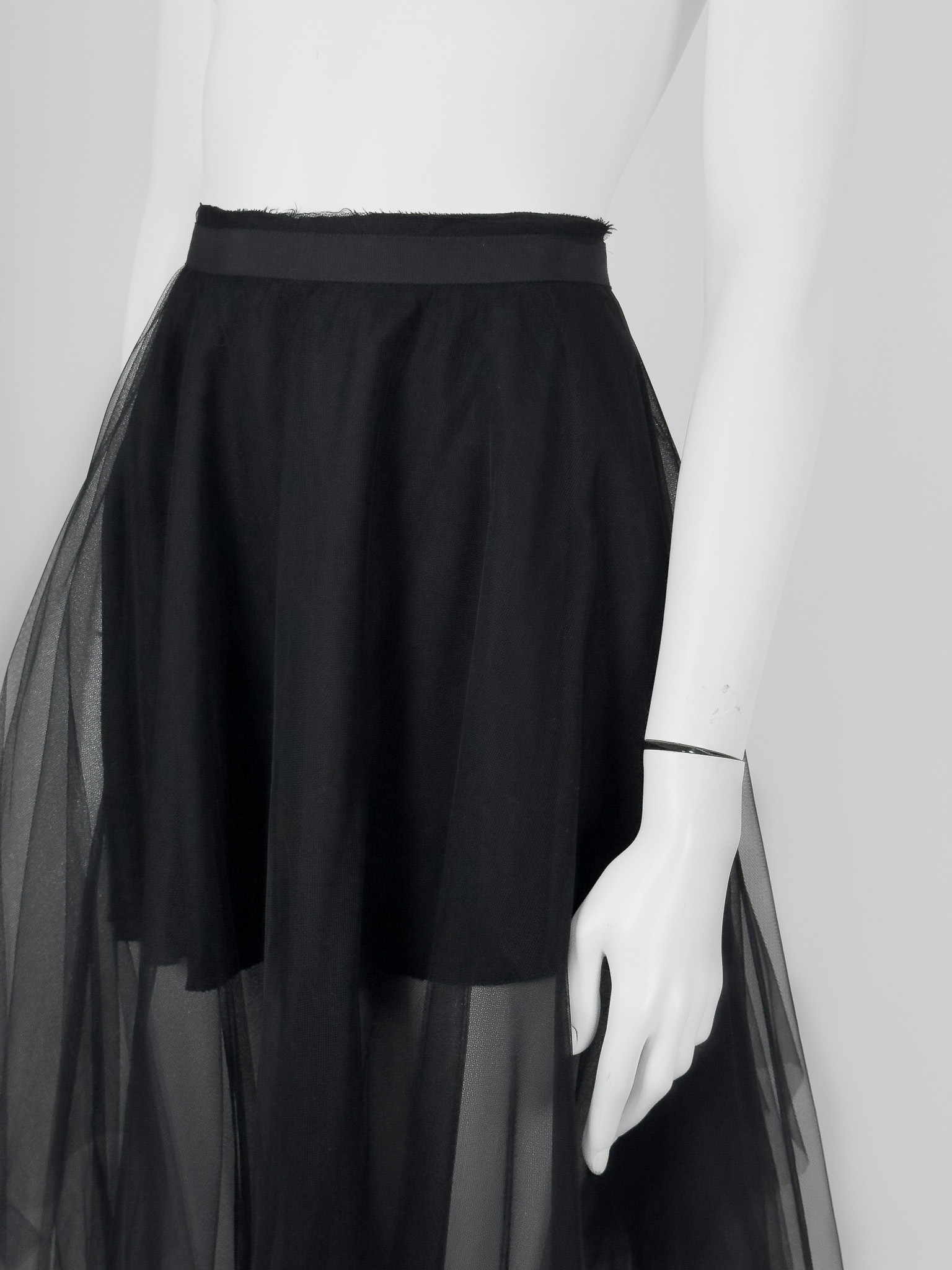"Czarna tiulowa spódnica z krótszą podszewką, częściowo transparentna, czarna wstążka w pasie, zapinana na kryty suwak oraz haftkę. Rozmiar z metki FR 44. Stan bardzo dobry. Wymiary: szerokość w pasie 44cm, długość całkowita 83cm."