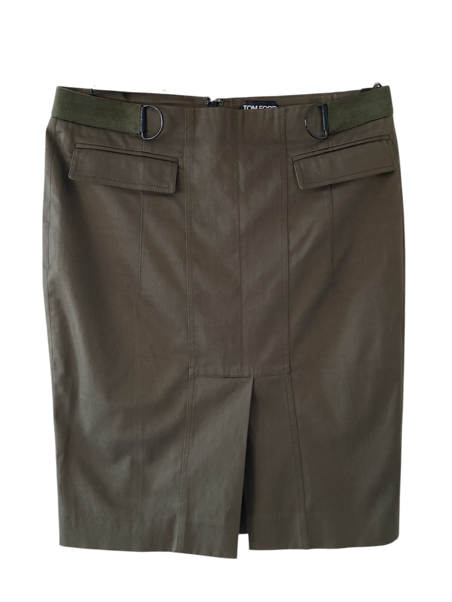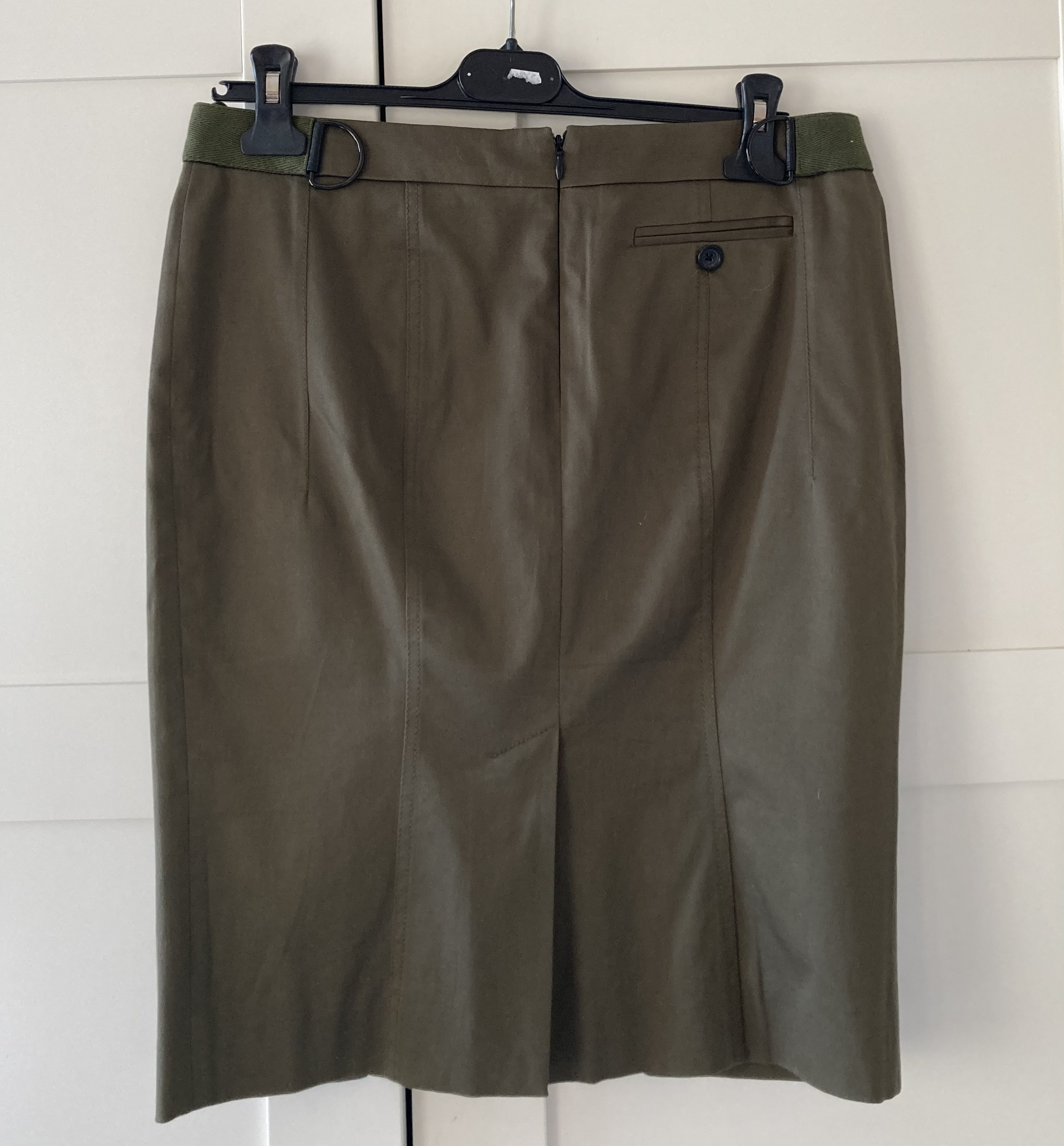 "Spódnica w kolorze khaki, w bardzo dobrym stanie. W składzie bawełna z dodatkiem elastanu, podszewka wykonana z jedwabiu. Wymiary: długość 55cm, talia 41cm, biodra 48cm. Rozmiar z metki IT 42."