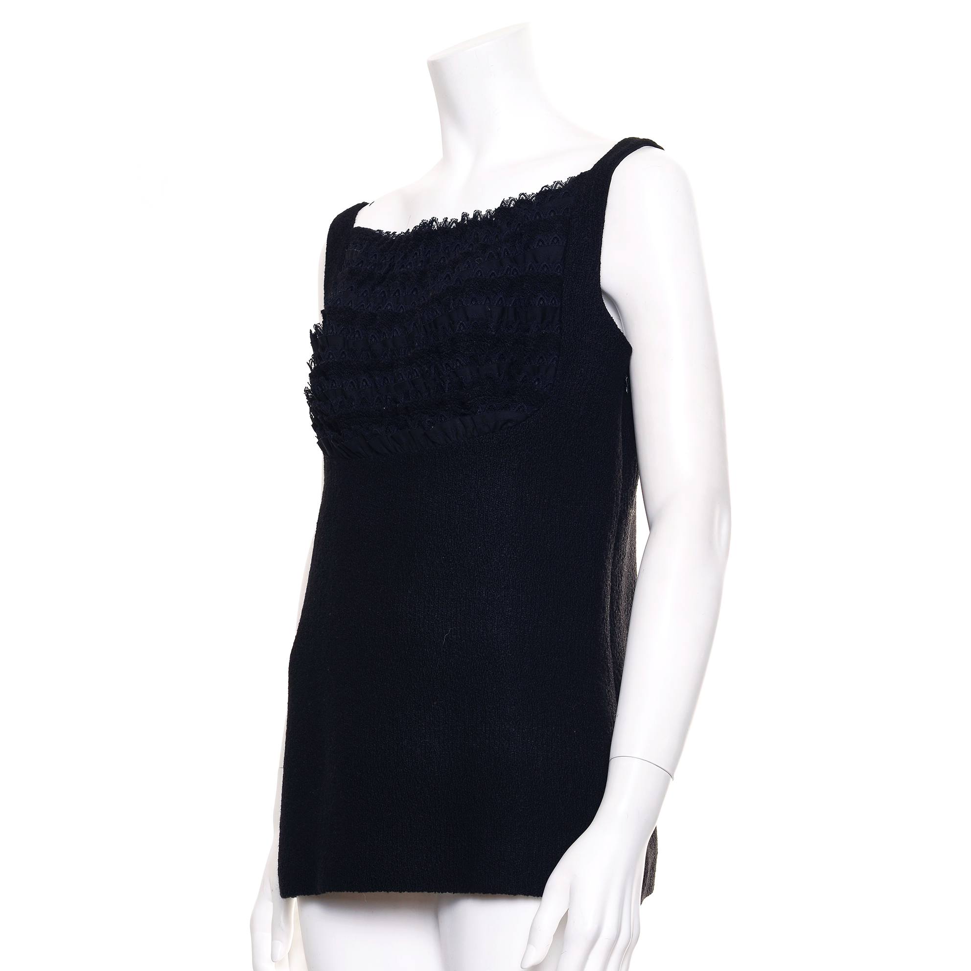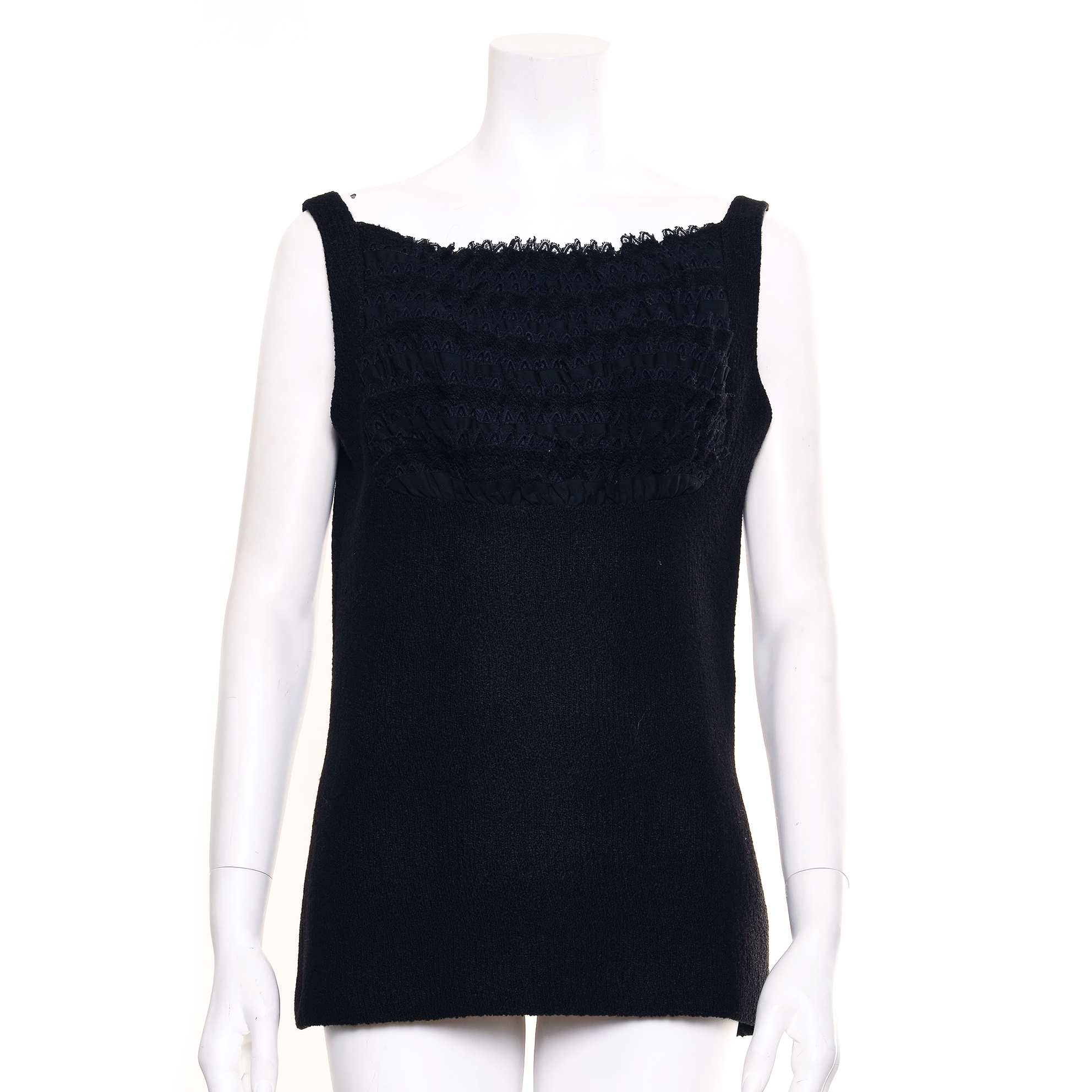 "Top bez rękawów, tweedowy, z falbanką i z koronką przy biuście , w bardzo dobrym stanie, rozmiar 44 ( it )"
