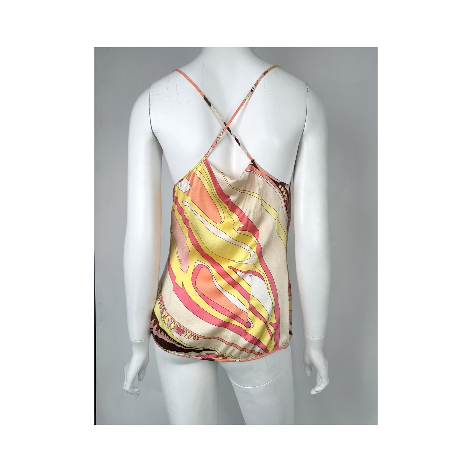 "jedwabny top na ramiączkach we wzory w kolorach różowo-pomarańczowo-żółtym. Rozmiar S. Skład: 94% jedwab, 6% elastan Wymiary: szer. biustu 38 cm, szer. talii 38 cm, dł. całkowita 56 cm."