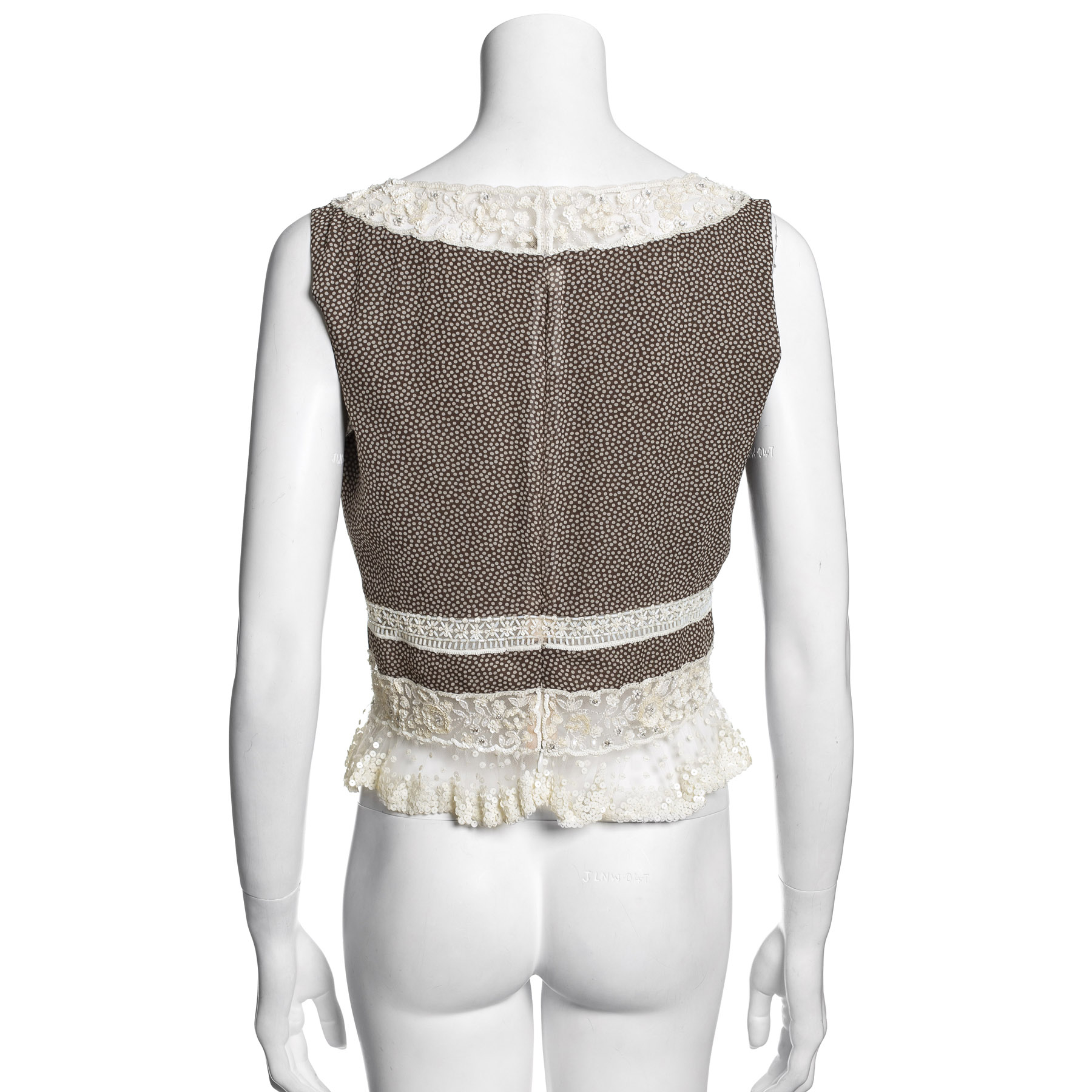 "beżowy top w kropeczki z ecru ozdobami, 100% jedwab, it 10; wymiary: biust 45 cm, szer. dołu 37 cm, dł. całkowita 49 cm"