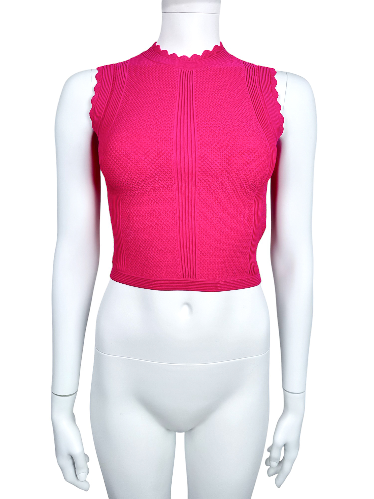 "Top w kolorze fuksji ażurowy z falbankowym wykończeniem przy rękawach oraz dekolcie, roz. 0. Wymiary: szerokość mierzona od pachy do pachy 35cm, długość całkowita 45cm."