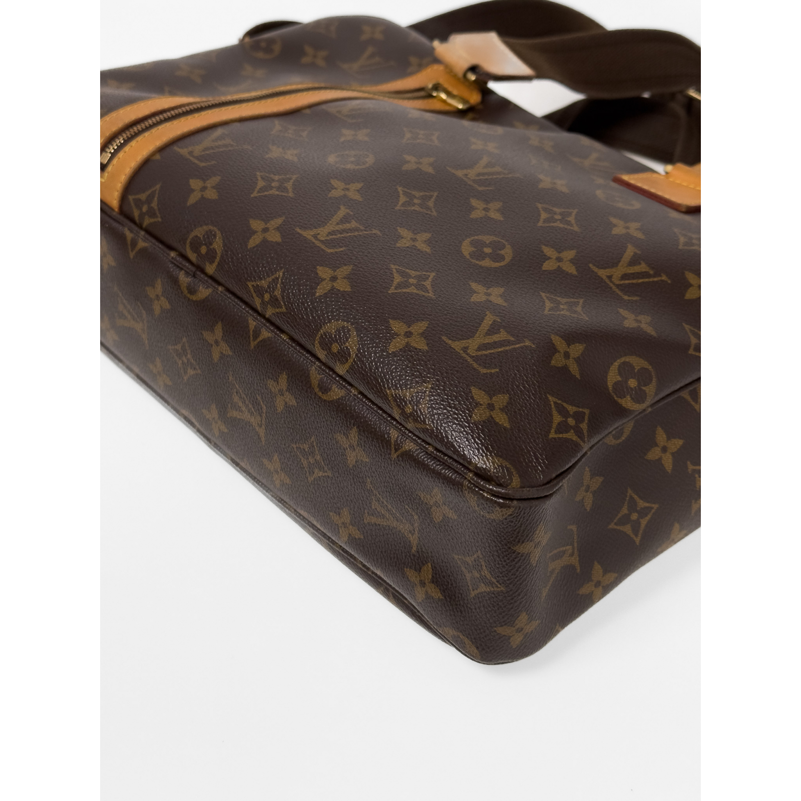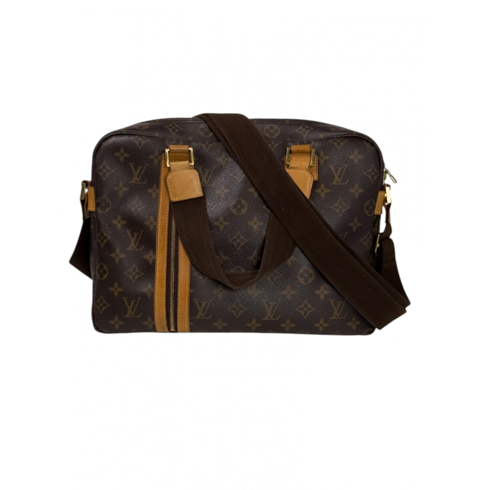 "Brązowa torba w monogram marki, na laptop , dwa materiałowe uchwyty do ręki, długi pasek na ramię, złote okucia, zapinana na dwa logowane suwaki, zasuwana kieszeń na przodzie, jedna duża komora wewnątrz z dwoma kieszeniami, rachunek oraz worek przeciwkurzowy w komplecie. Rok zakupu 2008 . Stan dobry, przetarcia na metalowych elementach oraz na rogach torebki. Wymiary: szerokość 34cm, wysokość 23cm, głębokość 8cm."