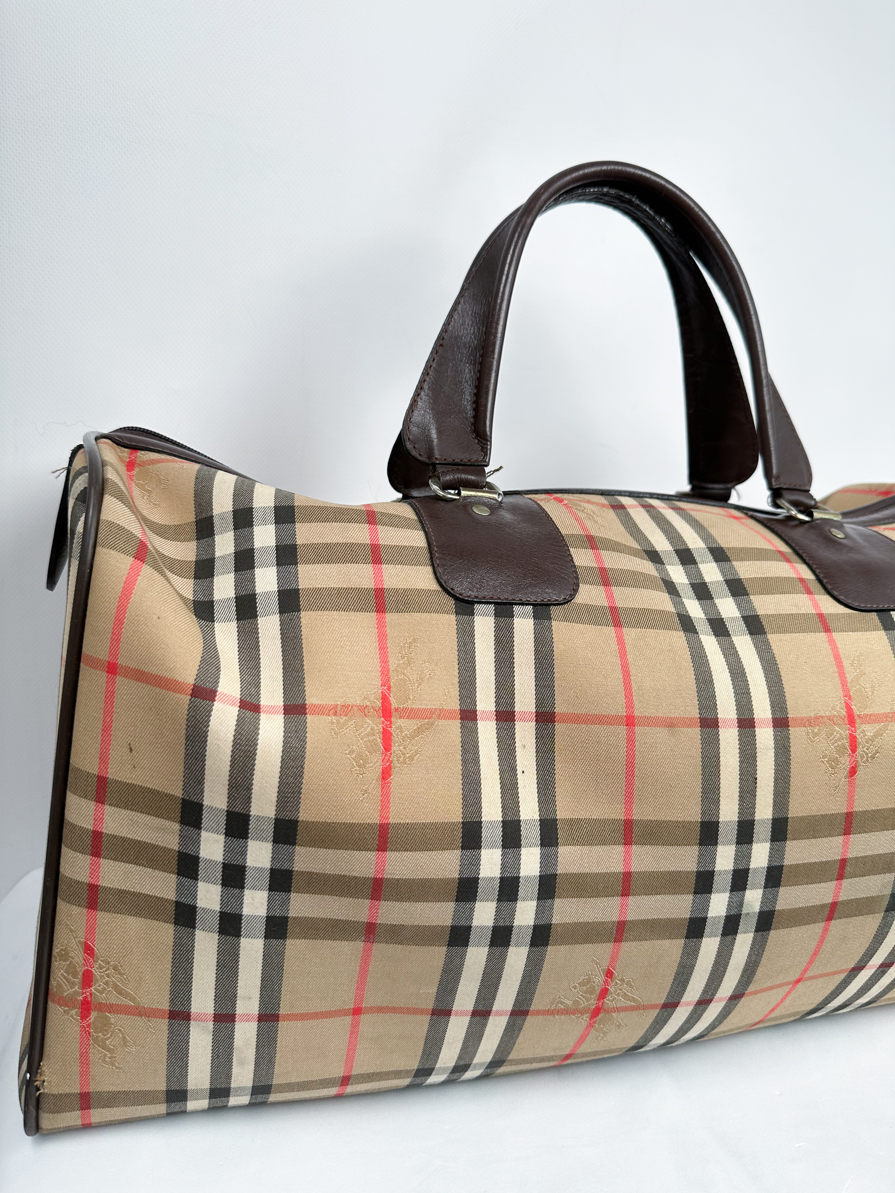 "Podróżna torba vintage w motyw charakterystycznej dla marki kraty, posiada skórzane brązowe wykończenia oraz złote elementy, zapinana na zamek, po jednej stronie kieszeń, metalowe nóżki na spodzie, czarne wnętrze. Stan dobry, posiada lekkie zabrudzenia oraz małą dziurkę na rogu. Wymiary: szerokość 50,5cm, wysokość 25cm, głębokość 22cm."