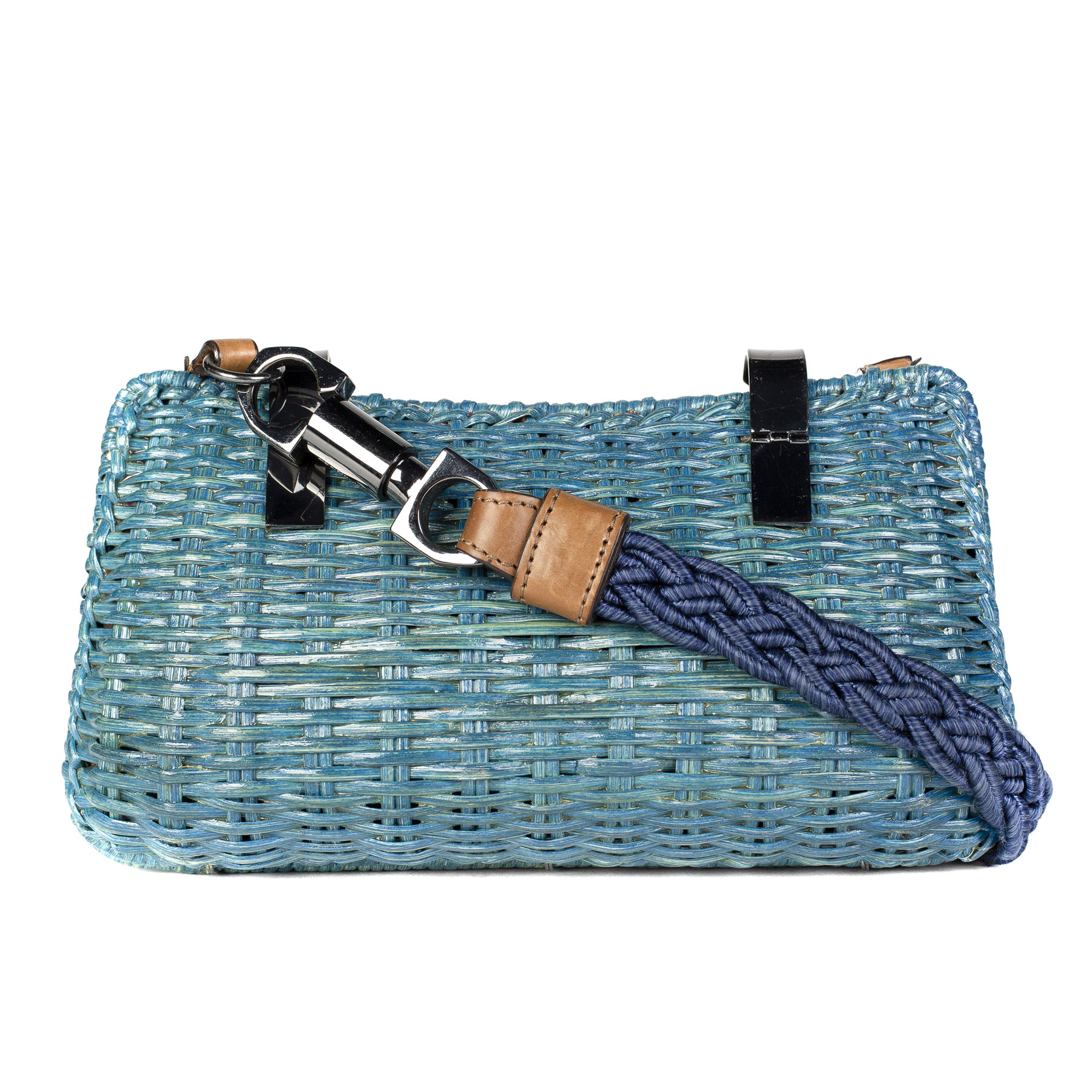 "Drewniany, pleciony kuferek w kolorze morskim na granatowym pasku, zapinany na metalowy zatrzask, w środku woreczek przeciwkurzowy.Wymiary: szer. 24 cm., wys. 11 cm. głębokość 6cm."