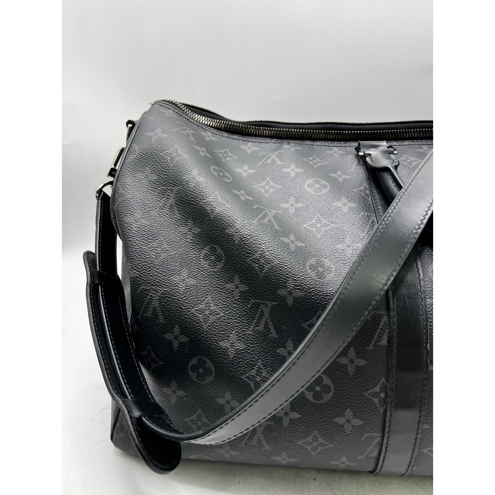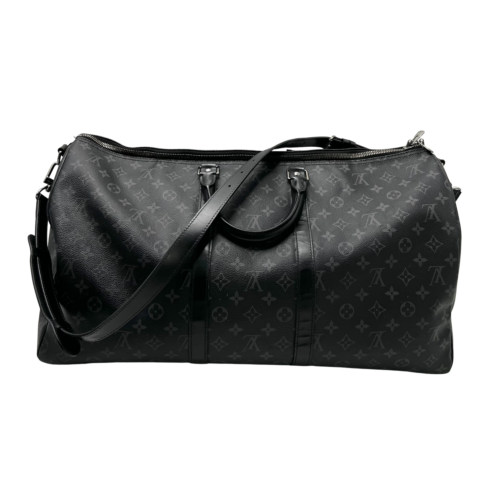 "czarna logowana torba Keepall. Wymiary: szer. 55 cm, wys. 32 cm, podstawa 34 cm, dł. paska 102 cm, dł. rączki 25 cm."