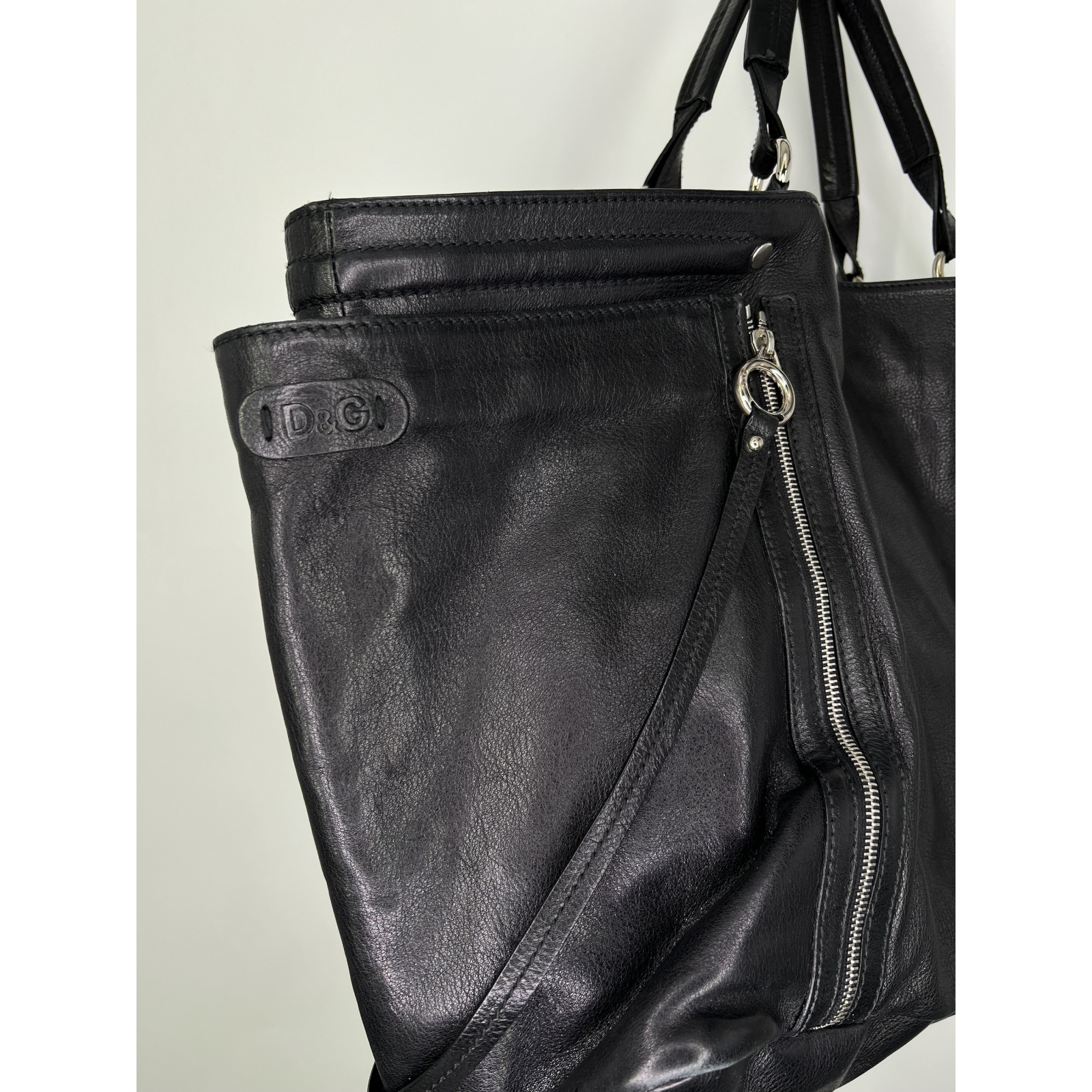 "duża, czarna, skórzana torba do ręki, ze srebrnymi elementami i suwakami, w środku czarny materiał. Model Bag Gaia. Wymiary: szer. 58 cm, wys. 34 cm, podstawa 21 cm, dł. rączki 39 cm."