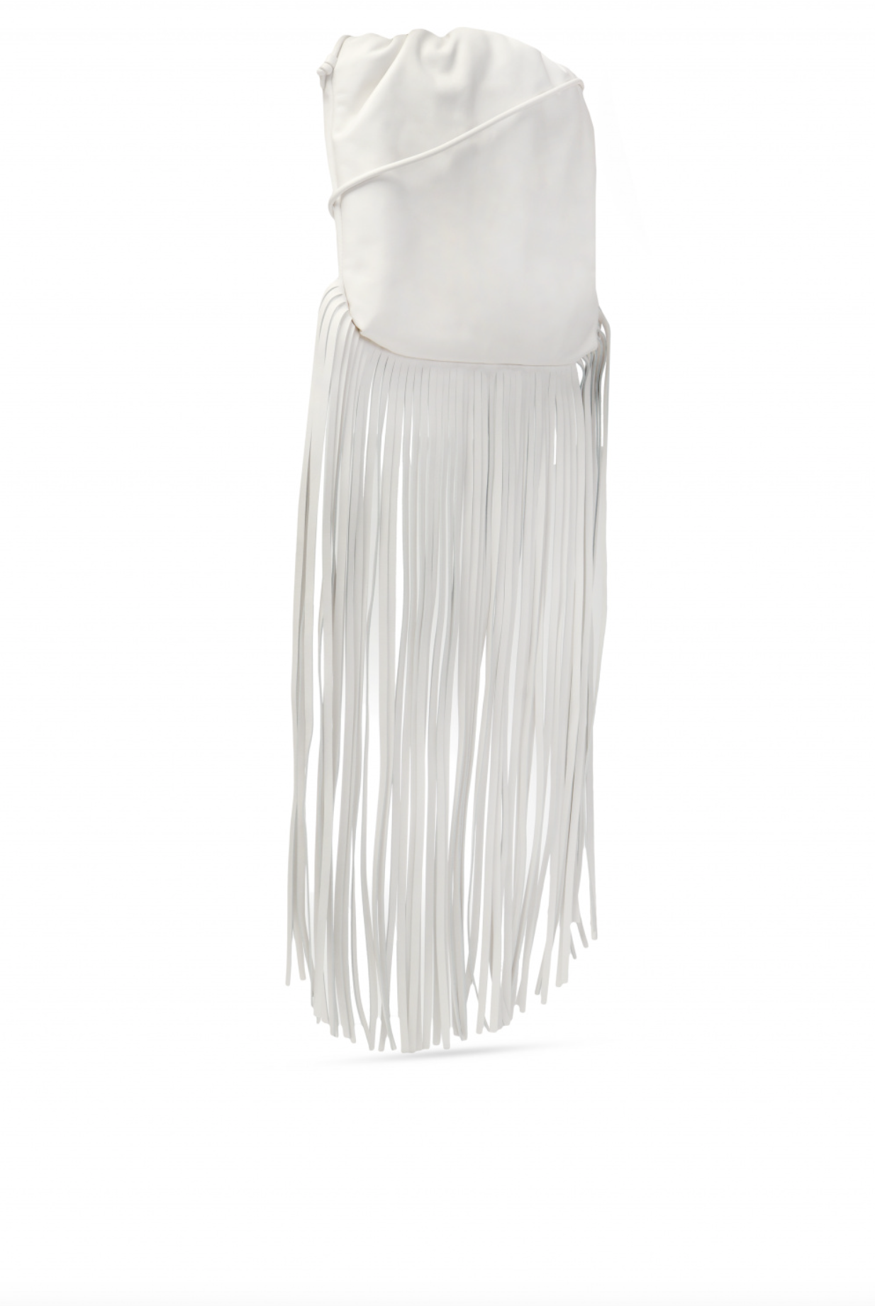 "Biała skórzana torebka ozdobiona długimi frędzlami, regulowany skórzany pasek na ramię i do ręki, jedna komora wewnątrz z dwoma kieszeniami, złote kryte pod skórą zapięcie. Stan bardzo dobry. Model ‘THE FRINGE POUCH’. Wymiary: 27 cm x 32 cm"